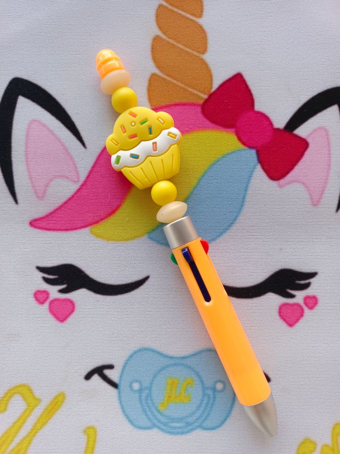 Stylo 4 couleurs Cupcake 100% personnalisable en silicone alimentaire et/ou bois naturel, encre noir, bleu, rouge et vert. Énormément de choix pour les composants, envoyez-moi un message afin de créer main dans la main votre accessoire idéal. Une photo du prototype de celui-ci vous est envoyé pour validation avant envoi.