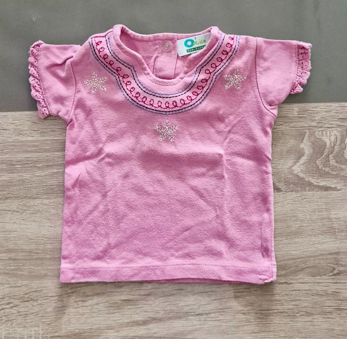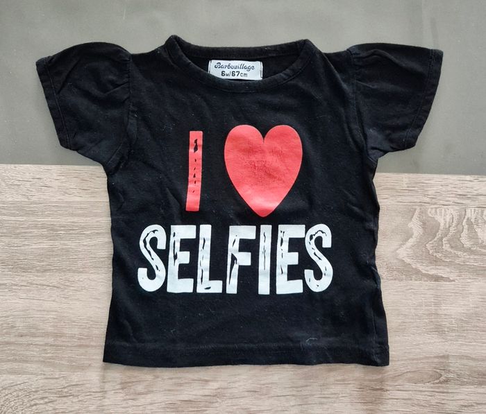 Bonjour Je vends un lot de 3 t-shirts à manches courtes pour bébé fille, parfait pour l'été ou sous un gilet. ​Taille : 6 mois (67 cm). ​Composition du lot : - ​1 t-shirt rose OKids (Vertbaudet) avec broderies fleurs et manches à volants. - ​1 t-shirt écru OKids (Vertbaudet) à motifs fleurs violettes et col dentelle. - ​1 t-shirt noir Barbouillage avec inscription "I ❤️ SELFIES" et manches papillon. ​Praticité : Les deux modèles Vertbaudet s'ouvrent par pressions au dos pour un habillage facile. ​État : Très bon état. N'hésitez pas, j'envoie rapidrment.
