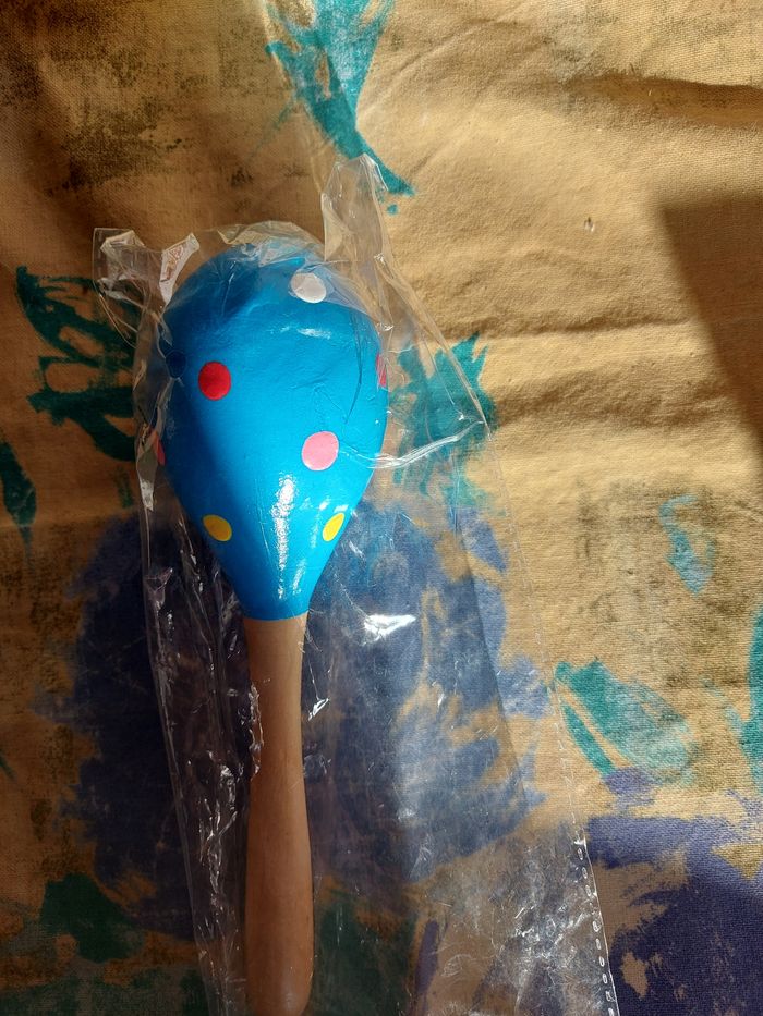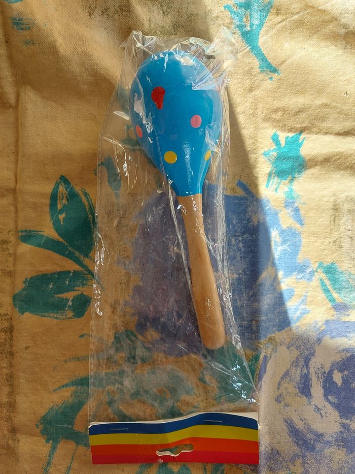 Hochet bleu en plastique avec manche en bois L 19 cm neuf
