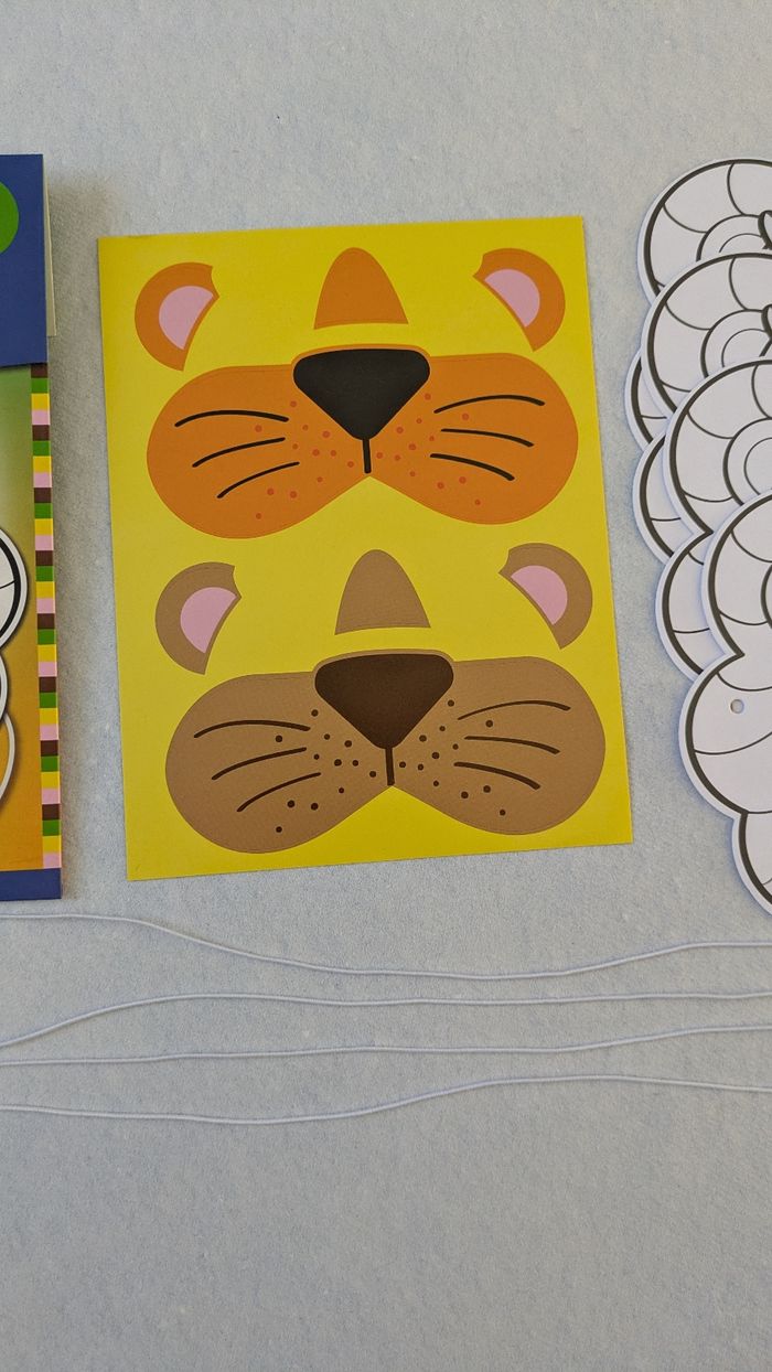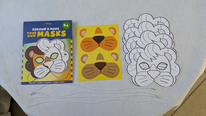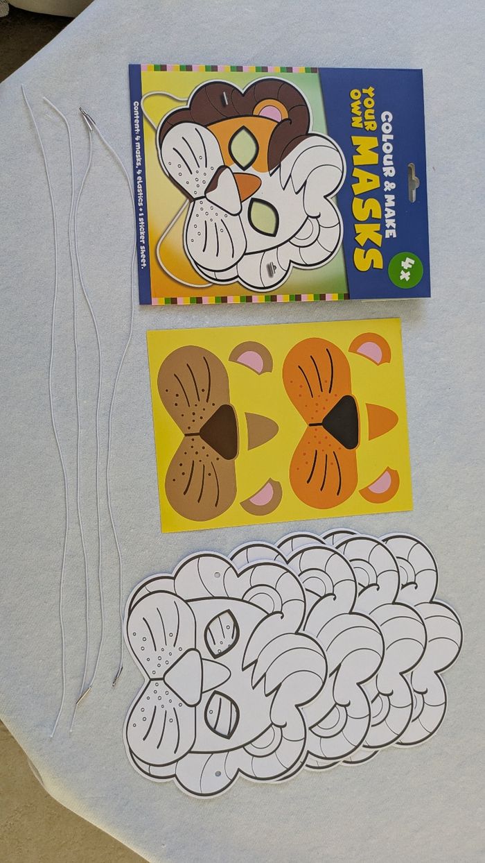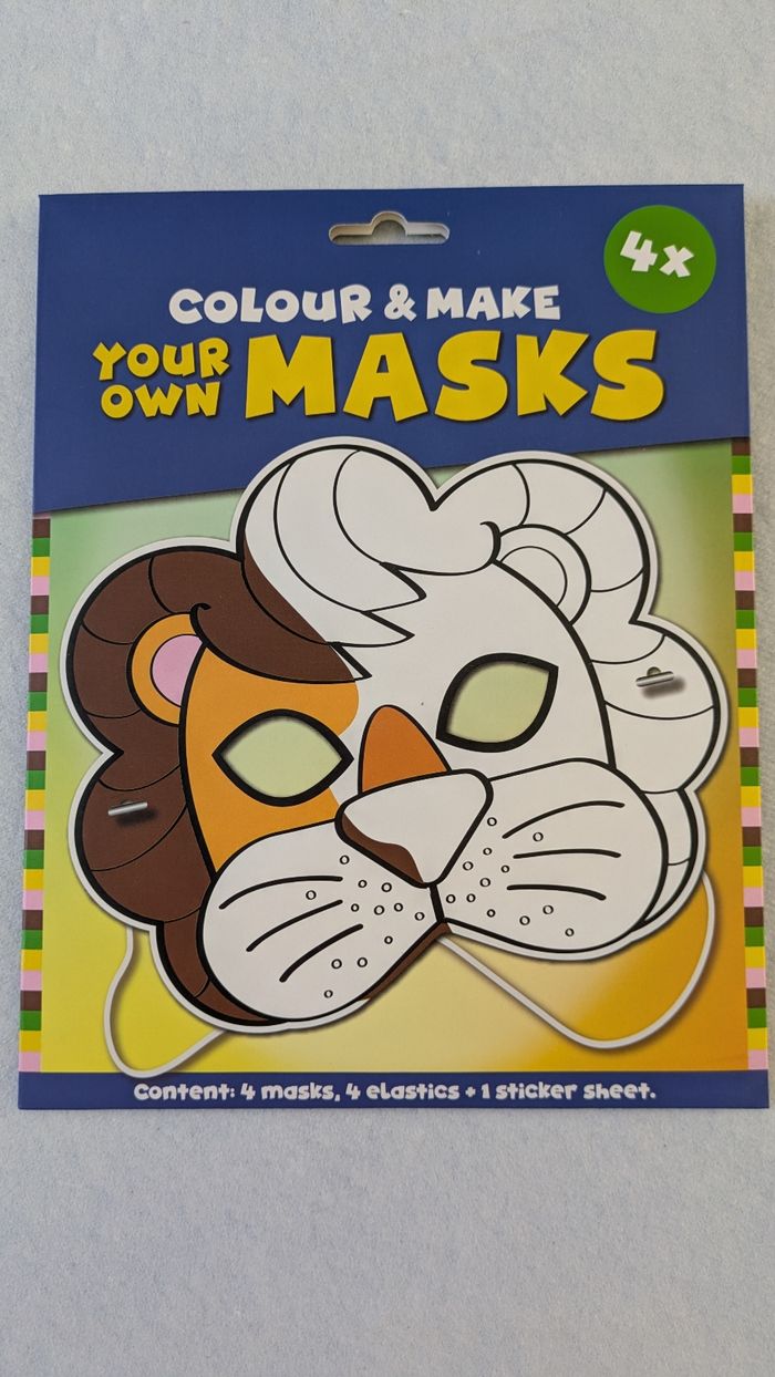 Bonjour, Vends lot de 4 masques Lion à colorier avec élastiques et autocollants en très bon état. A partir de 3 ans