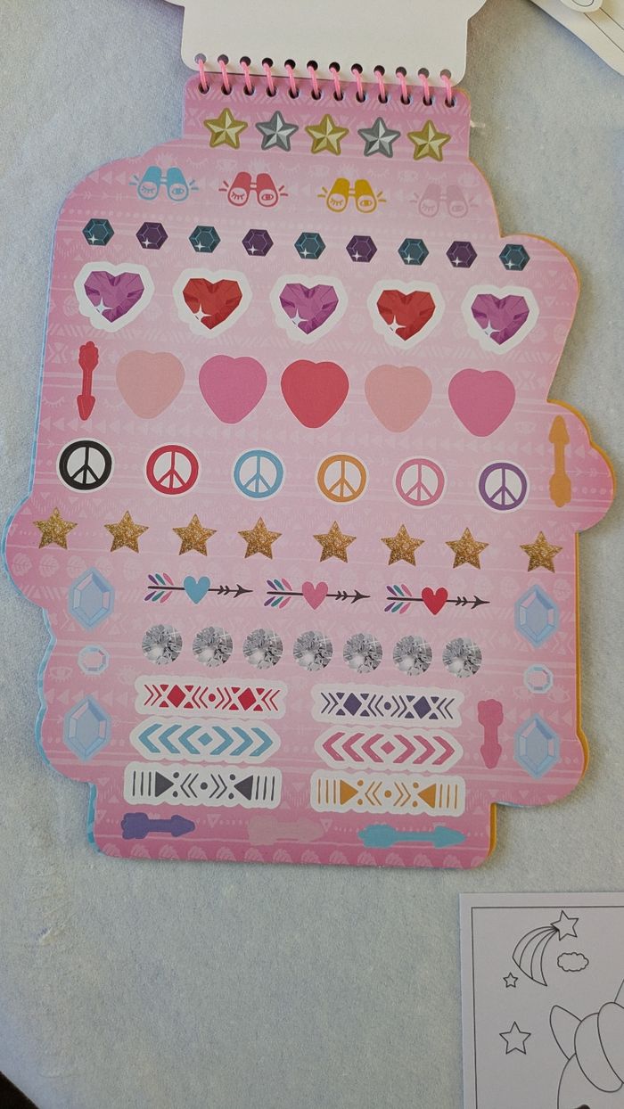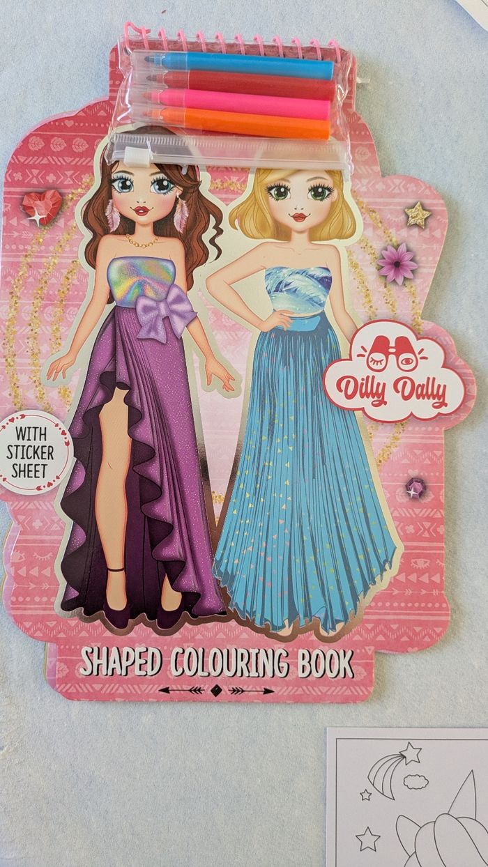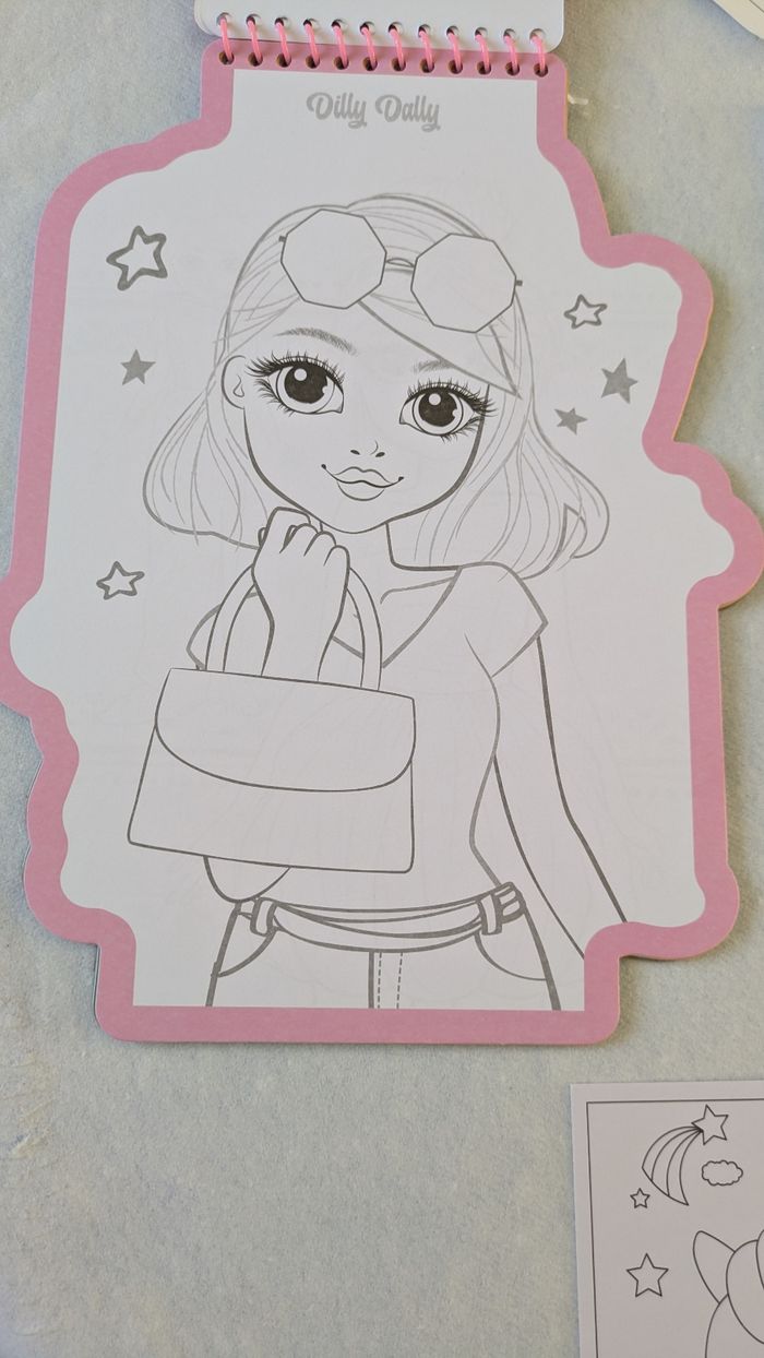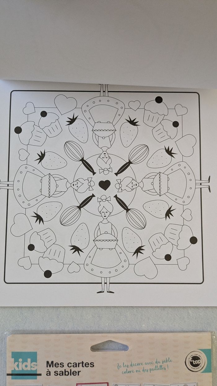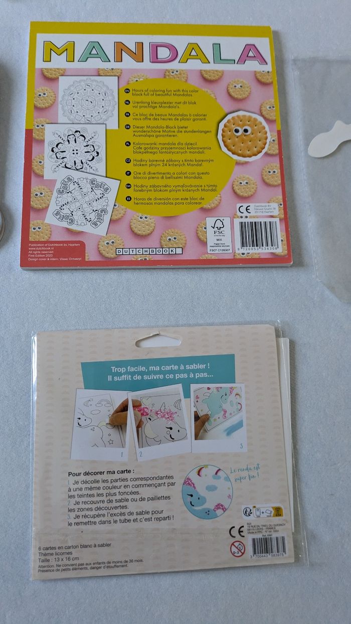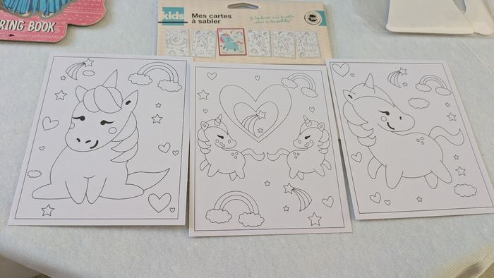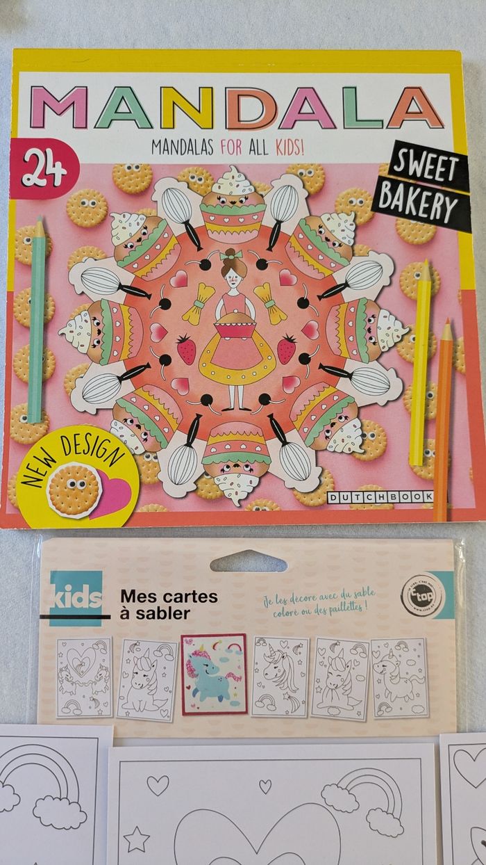Bonjour, Vends lot loisirs créatifs enfant comprenant un coloriage de 22 feuilles de dessin de mannequin femme avec autocollants et 4 petits feutres en très bon état ( feutres neufs ) , un coloriage Mandala sweet Bakery neuf , un lot de 3 cartes licornes à sabler et un pantin fille à monter et à décorer A partir de 3 ans.