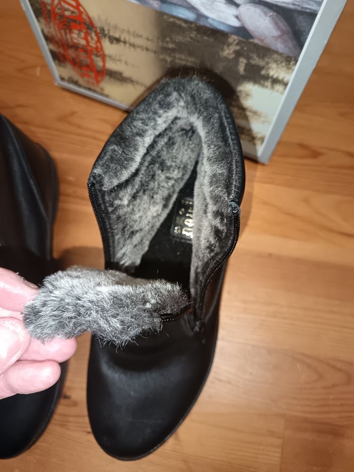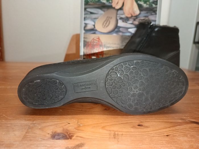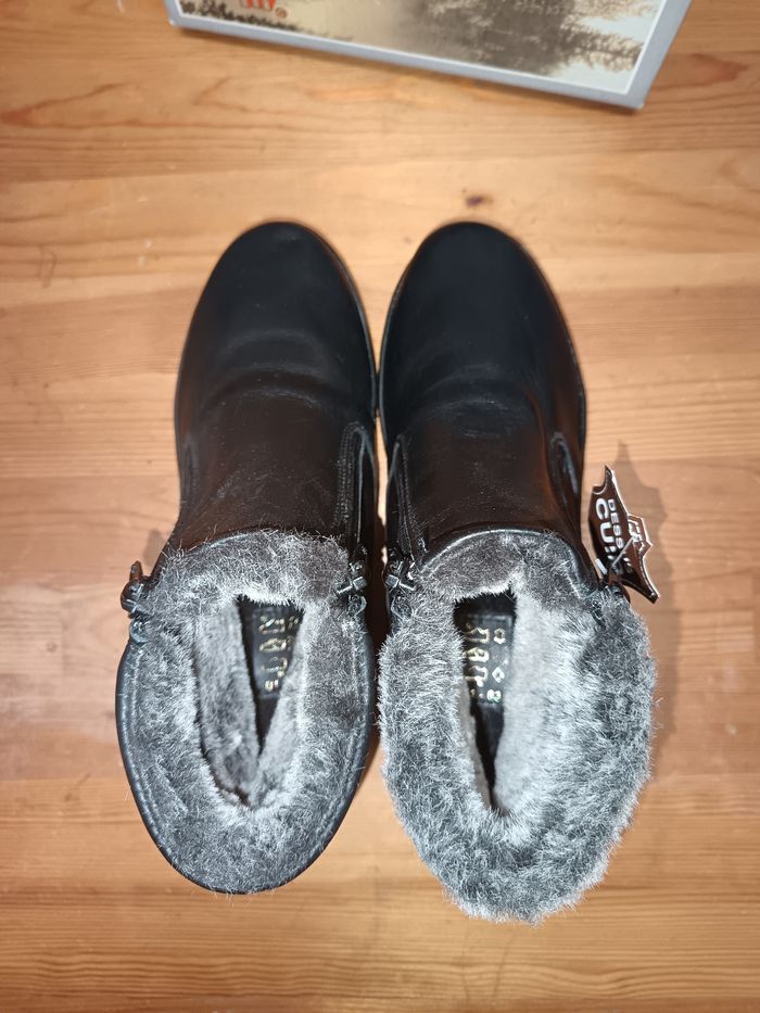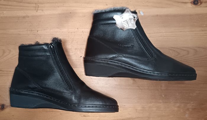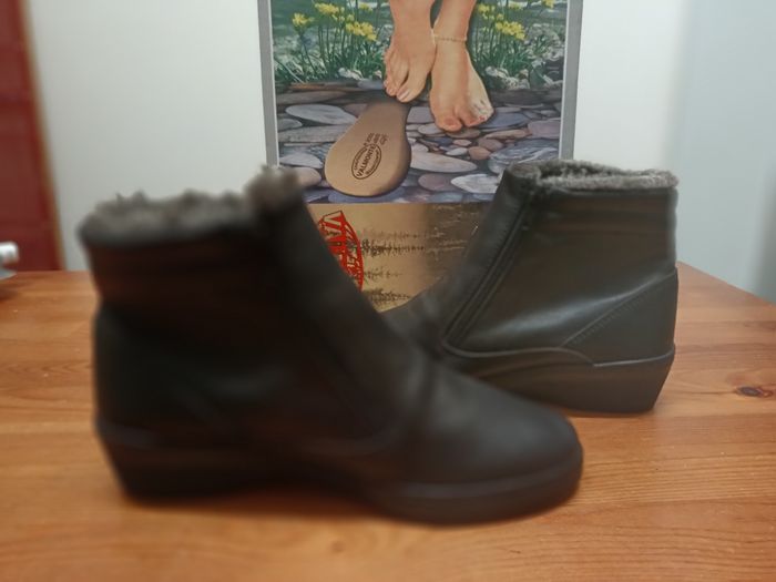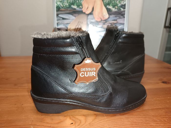 Bonjour Bottine neuve jamais portée, dessus cuir, intérieur fourré. Double ouverture par fermeture éclair pour faciliter l'enfillage. Talon 4 cm et semelle 1 cm. Taille 37 de la marque Valmonte made in Portugal. Valeur 65€. Mon prix reste fixe. Elles sont neuves dans boite d'origine. A bientôt
