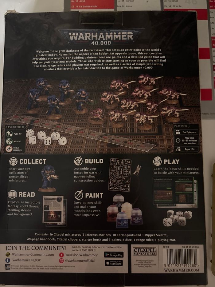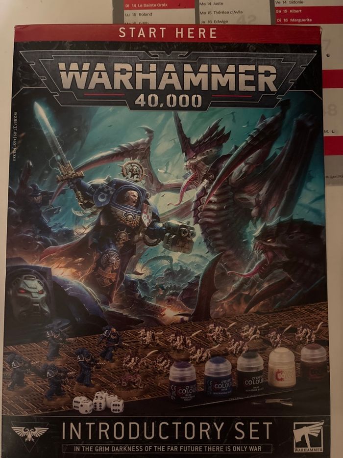 Kit de démarrage warhammer 40 k Comprenant : -peintures -figu brunes Space marine -figurines tyrranid - dés et plateaux - livret d’introduction