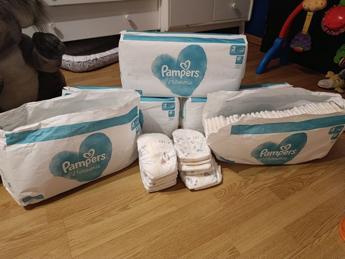 Bonjour je vends des couches Pampers harmonie taille 3 de 6-10kg Il y a 3 paquets neuf non ouverts 1 paquet neuf ouvert 1 paquet il y en a 17 Soit 209 couches