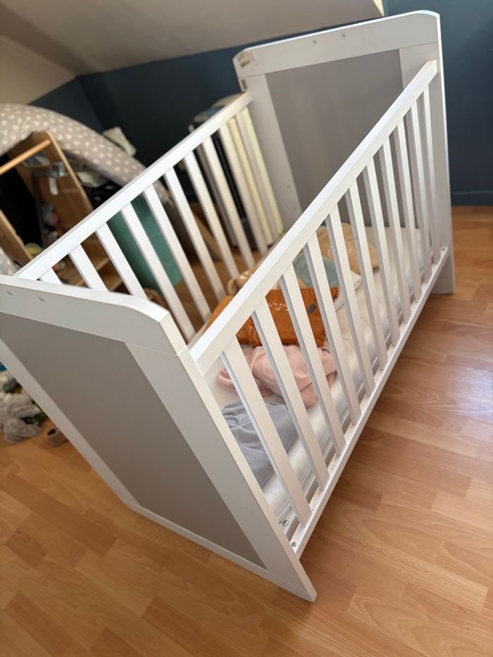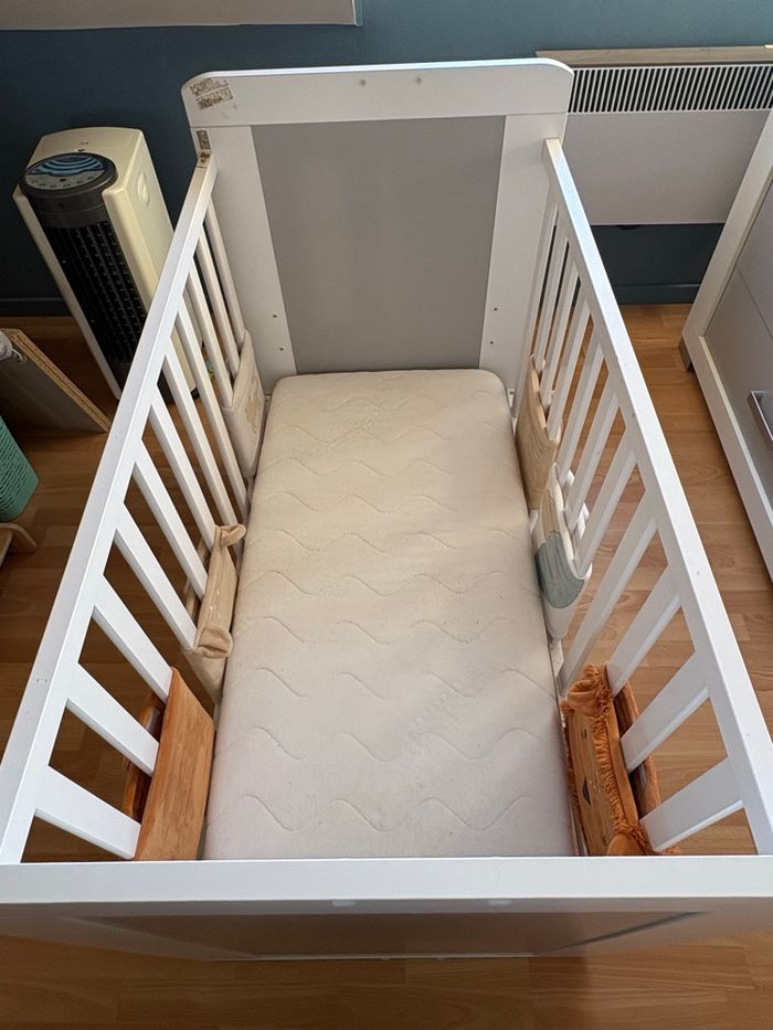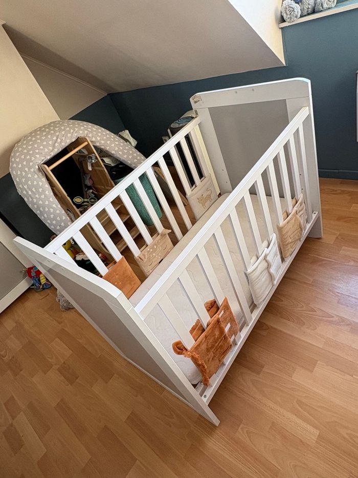 Lit à barreaux vendu avec : - matelas - 2 housses - aerosleep - protection de barreaux - Noukies Région : Silly (Belgique) Déjà démonté et prêt à être emporté. Pas d’envoi vu le volume