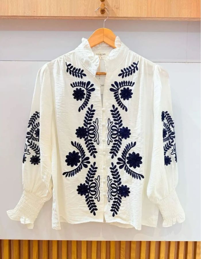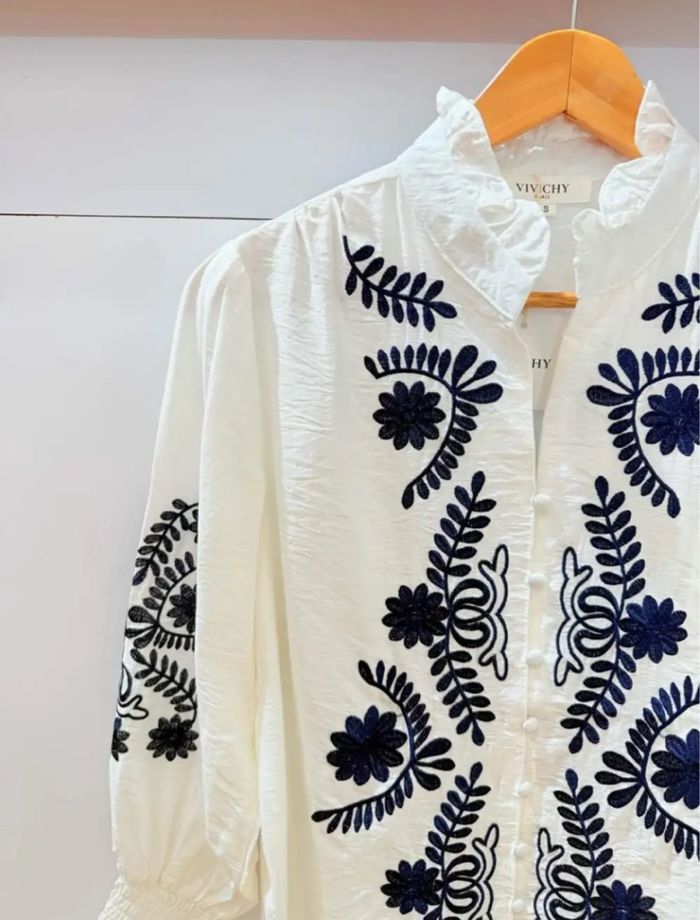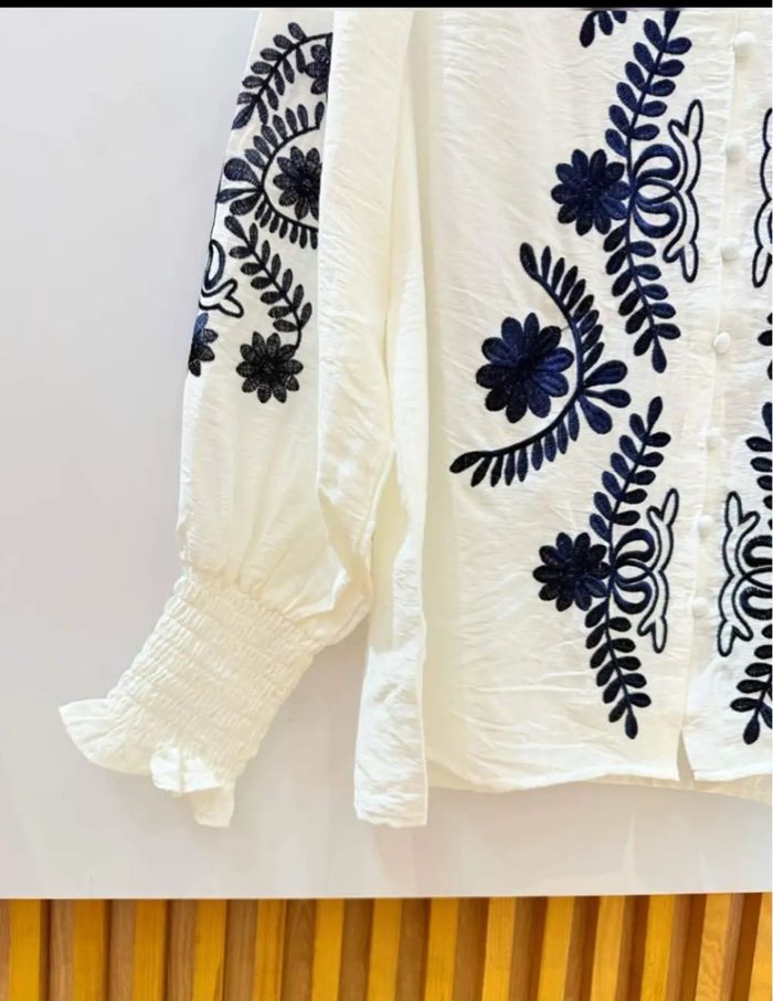 Magnifique chemise blanche avec broderies marine , jamais portée , col rond et manches longues Taille 46 Largueur sous aisselles 64 cms 75% viscose 25% polyester