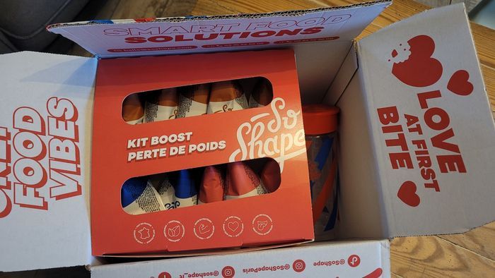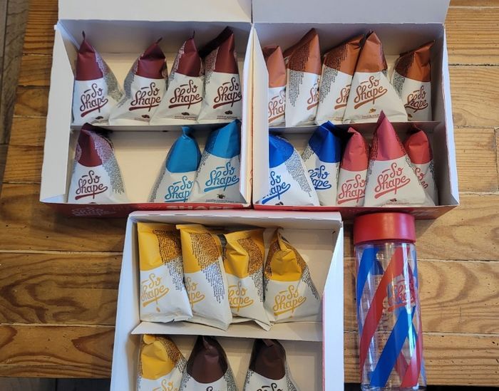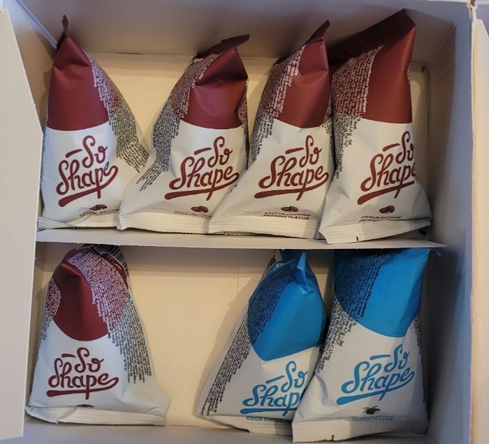Lot de 24 berlingots So Shape pour une durée de 12jours. 5 Vanille chocolat blanc 5 Noisette 5 Brownie 3 Fruits rouges 2 Chocolats 2 Coco 2 Oreo