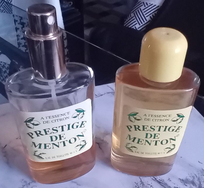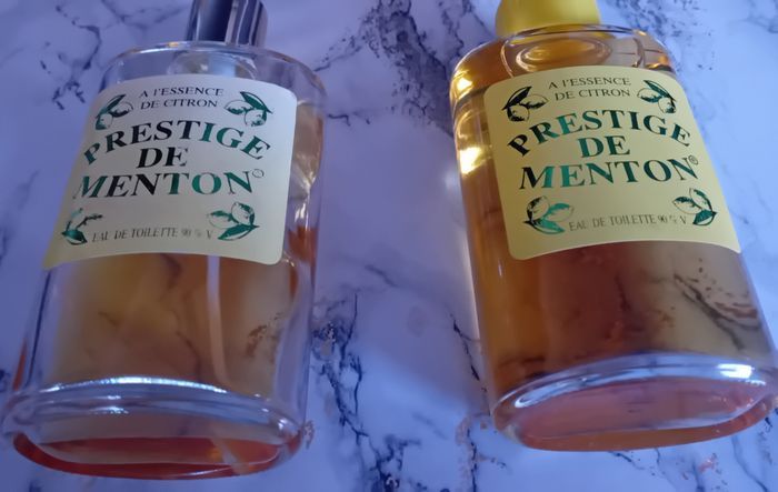 Ensemble vintage d'époque Prestige de Menton a l'essence de citron 🍋 composé d'un flacon splash neuf jamais utilisé et d'un flacon vaporisateur rechargeable dans lequel un tiers restant environ Contenance 100ml certainement pour chacun des flacons