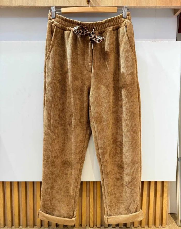 En velours extensible coloris camel , taille élastique avec lien à nouer, poche de chaque côté Taille unique qui va du 44 au 48 Longueur totale 105cms
