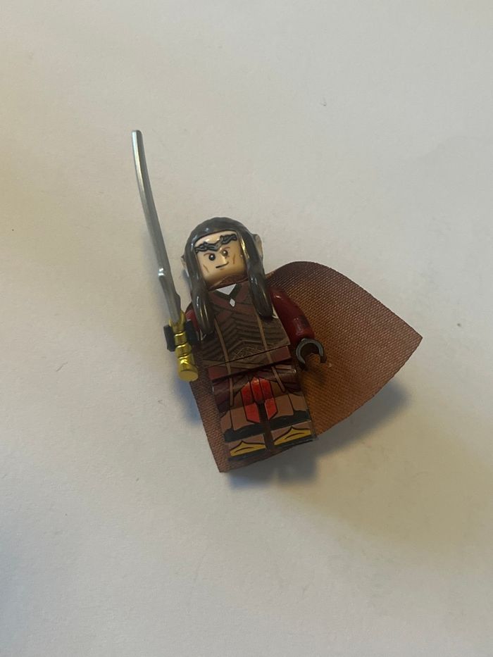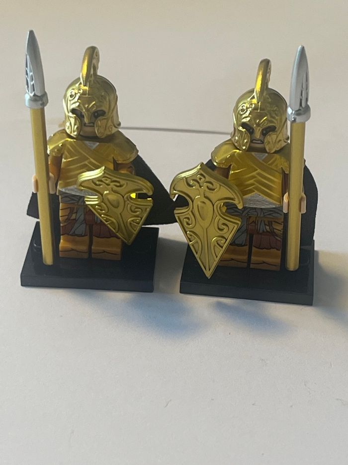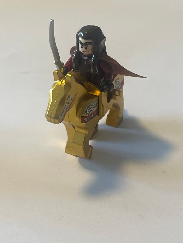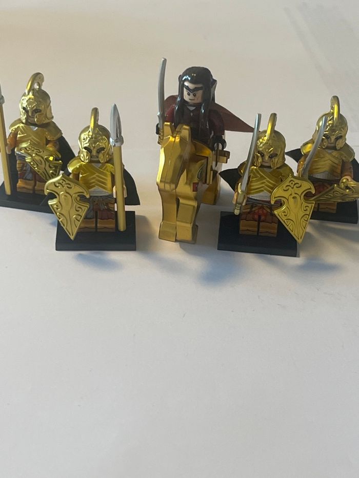 Lot de 6 figurines lego le seigneur des anneaux Lego compatible Elrond, 1 cheval doré , 4 guerriers Elfes Avec accessoires et plaques de présentation