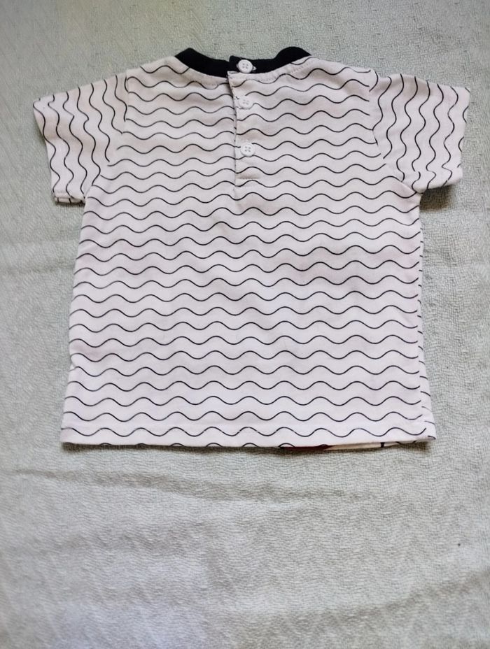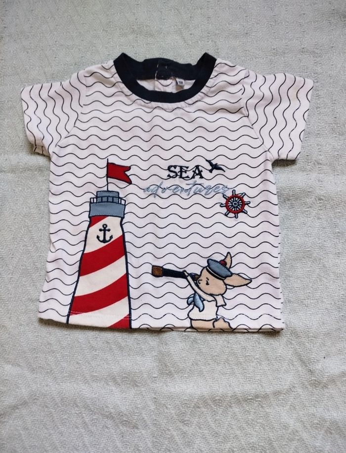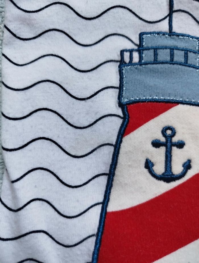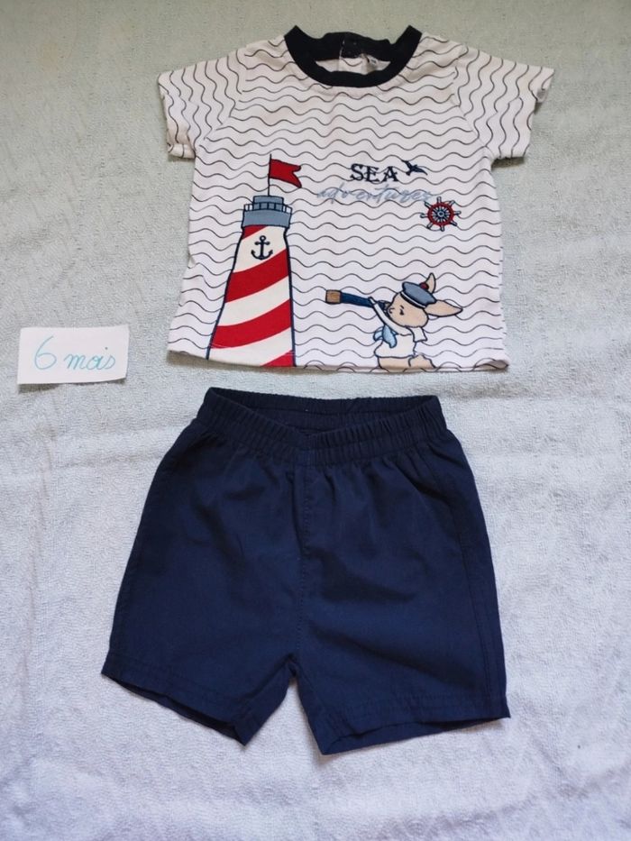 Short bleu marine et t-shirt Phare thème marin. 6 mois, pas d'étiquette de marque. 2 légères tâches visibles sur les 2 dernières photos. G78