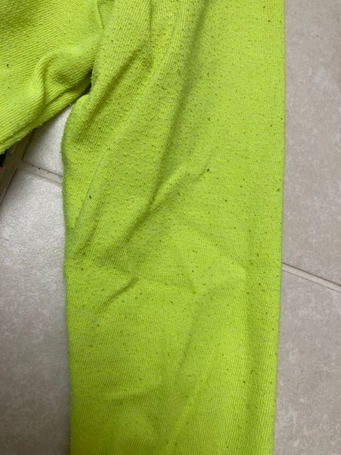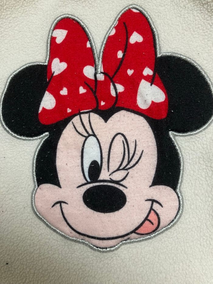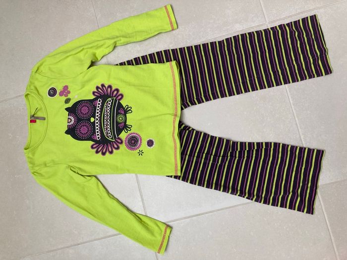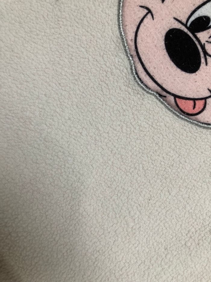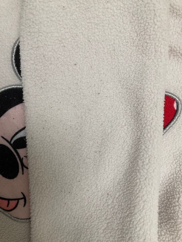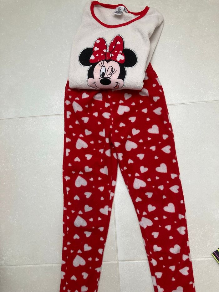 Le bleu : matière T-shirt avec un trai de stylo dans la flocage Le hibou : pantalon matière t shirt mais haut plus épais : matière qui bouloche - elles sont visibles sur les photos Le Minnie : En matière polaire et des bouloches aussi Je donne avec le lot un haut Shaun le mouton avec une tache