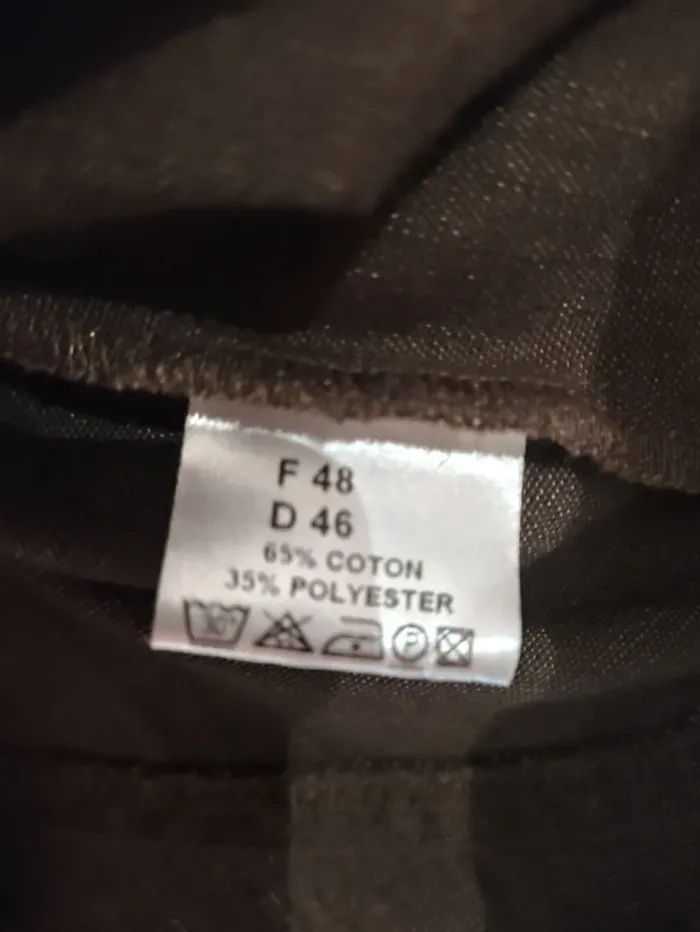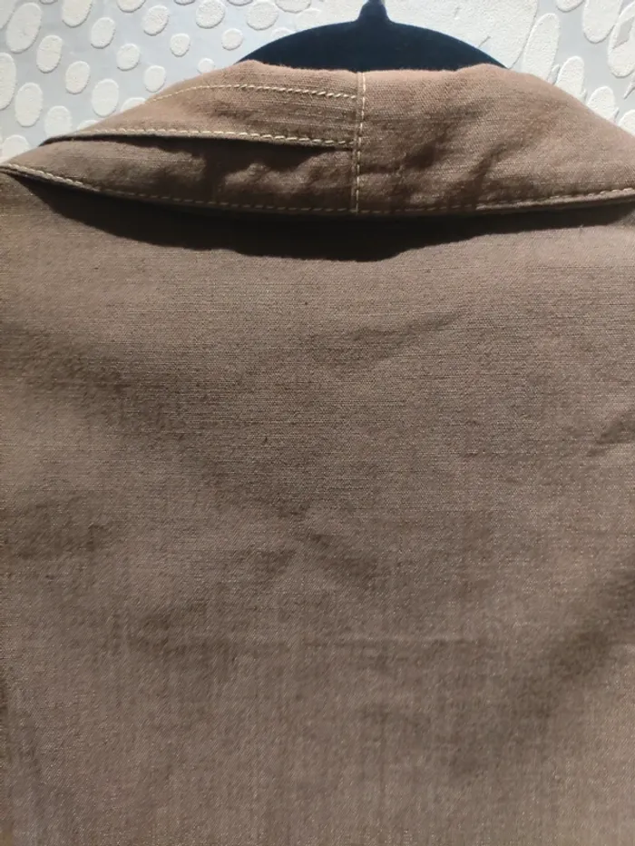 Blazer court et léger de la marque Christine Laure, idéal pour la mi-saison. Sa matière en coton et polyester le rend très confortable à porter. La couleur marron est une teinte intemporelle, facile à assortir. Les coutures apparentes de couleur crème lui donnent une touche d'originalité et mettent en valeur sa coupe ajustée. Le col est légèrement plissé et les poches à rabat sur le devant ajoutent une finition élégante. C'est une pièce basique et chic pour compléter votre garde-robe. Détails : Marque : Christine Laure Taille : FR 48 / D 46 Matière : 65% coton, 35% polyester #blouson #veste #christinelaure #marron #automne #printemps #48 #femme #basique #chic #legere