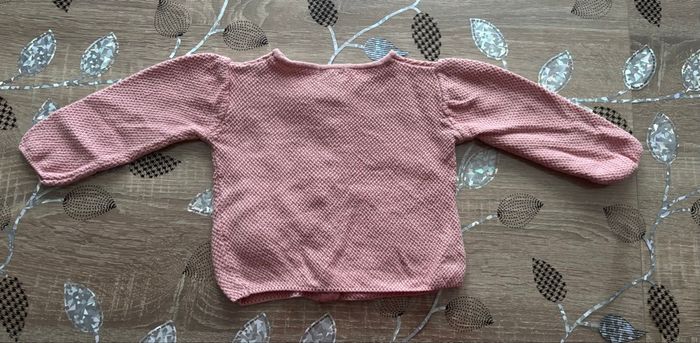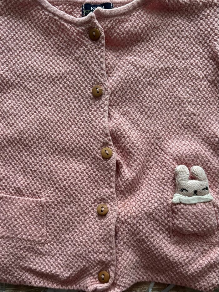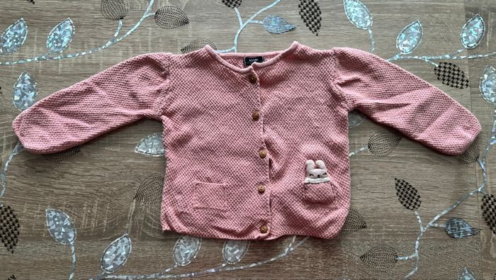 Adorable petit gilet rose en maille, tout doux et confortable. Boutonnage sur le devant, deux poches, avec un joli petit détail brodé (lapin) sur la poche. Parfait pour la mi-saison ou pour superposer en hiver Très bon état Marque : Kiabi Taille : 9 mois