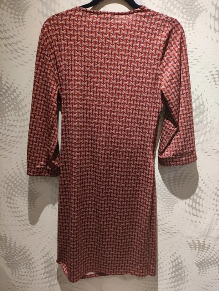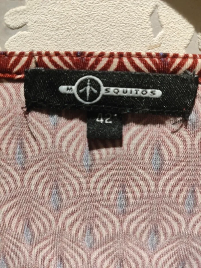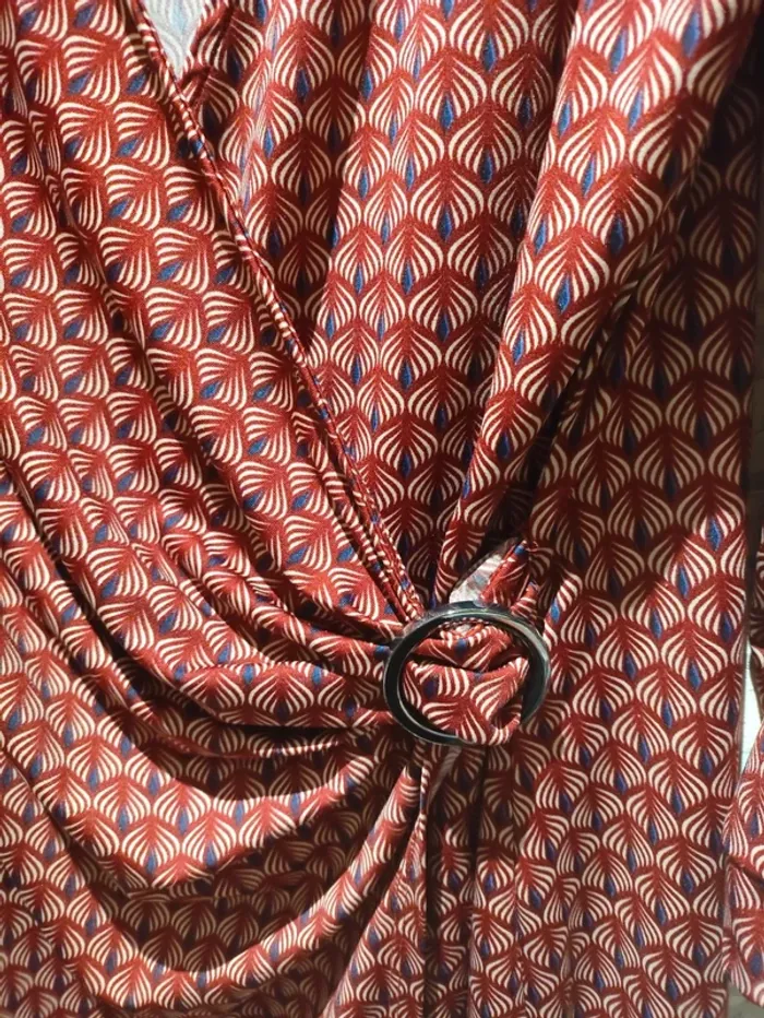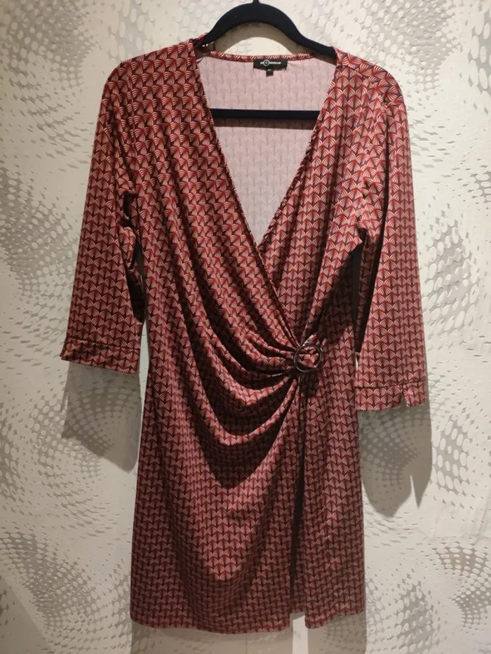 Robe T.42 mi-longue fendue décolleté cache-cœur rouge bordeaux Mosquitos à motifs - photo numéro 2