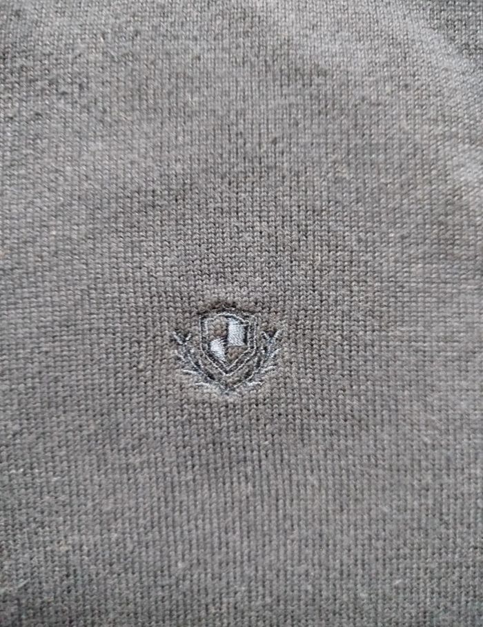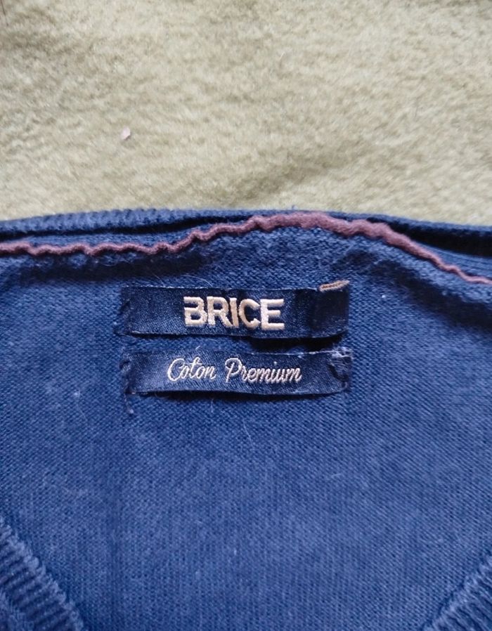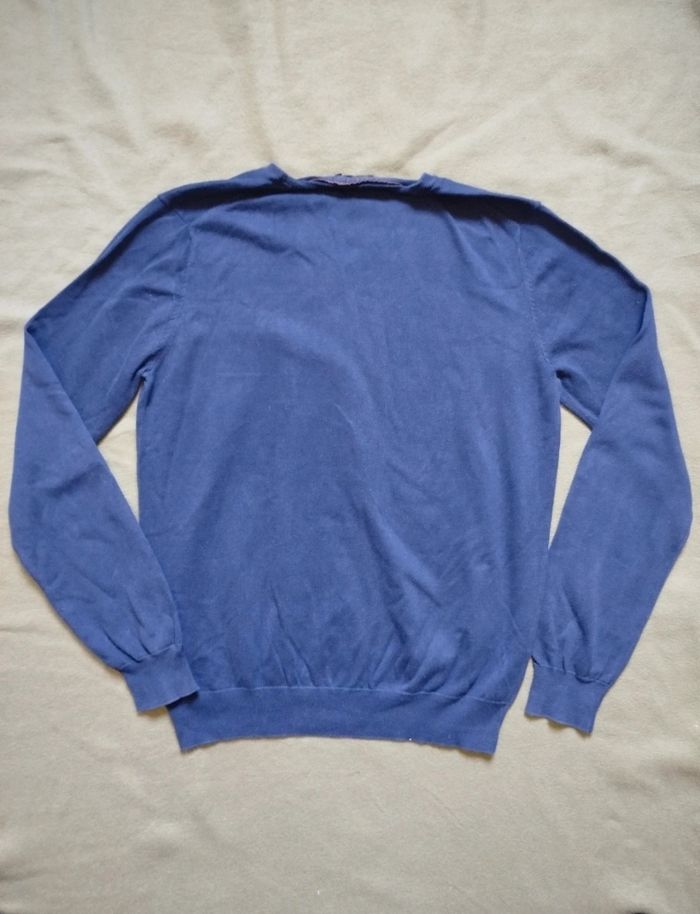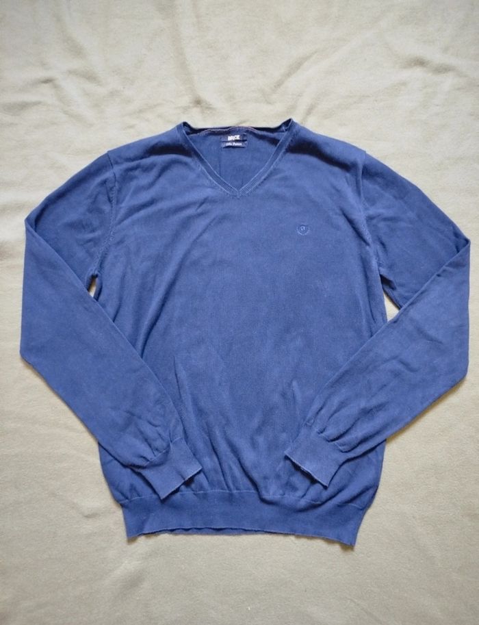 Pull fin bleu marine, col v. La véritable couleur, bien plus foncé , ressort mal en photo, elle est plus proche de celle avec la broderie. Brice, taille L. G279