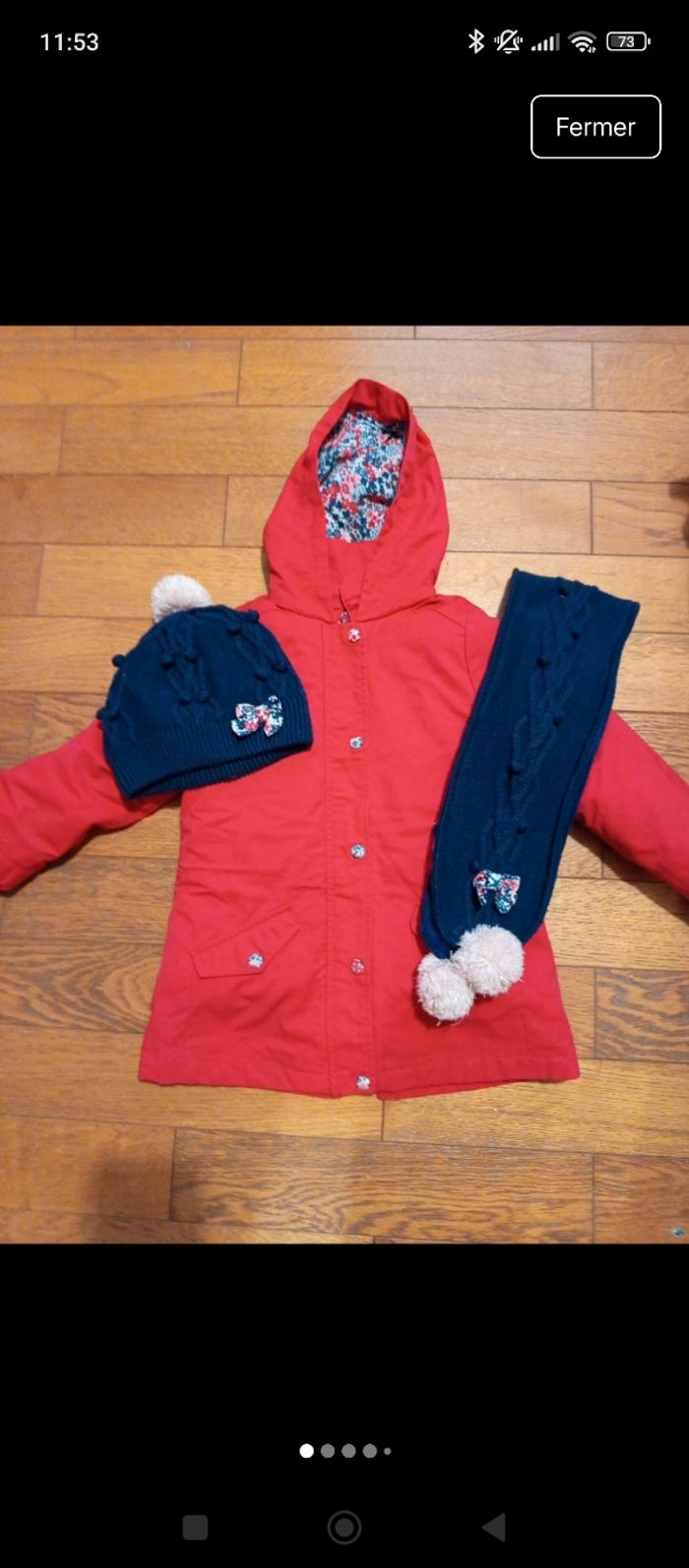 Manteau 3 en 1 sergent major avec doudoune sans capuche amovible et parka. Taille 6 ans. Bien porté mais reste en bon état. À noter les pressions abîmées aux niveaux des manches et un fil tiré cd photo Écharpe et bonnet T2 doublés polaire