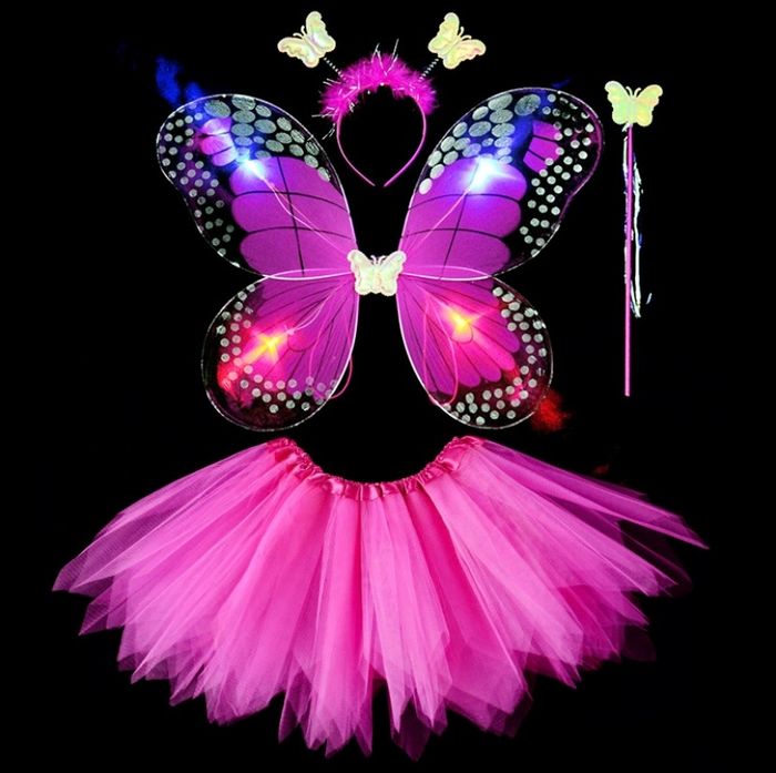 Déguisement papillon fushia à LED composé de 4 pièces ; une jupette, les ailes de papillon (élastique à enfiler), une baguette et un serre tête. Jupe tutu élastique. Taille unique, convient aux petites filles de 3-6ans. Vendu dans leur pochette d’emballage d’origine, idéal pour faire un cadeau ! Expédition rapide après votre commande.