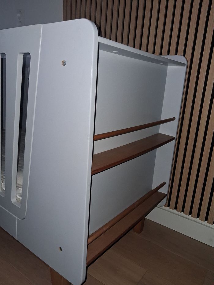Lit à barreaux évolutif Vertbaudet Design scandinave Gris clair et bois Se transforme en lit banquette une fois que l'enfant est assez grand pour en sortir tout seul 2 espaces de rangement sur un côté pour ranger les livres Étagère du bas a été réparée d'où petit prix sinon lit en très bon état Barrière amovible : un côté se dévisse pour transformer le lit en lit banquette Sommier réglable en hauteur sur 3 positions Couchage 60x120cm Matelas anti acarien et antireflux état neuf Remis en main propre sur Dax