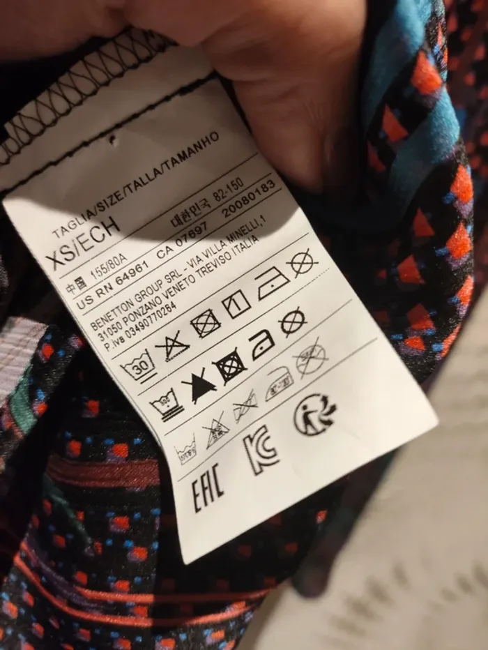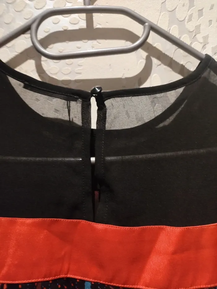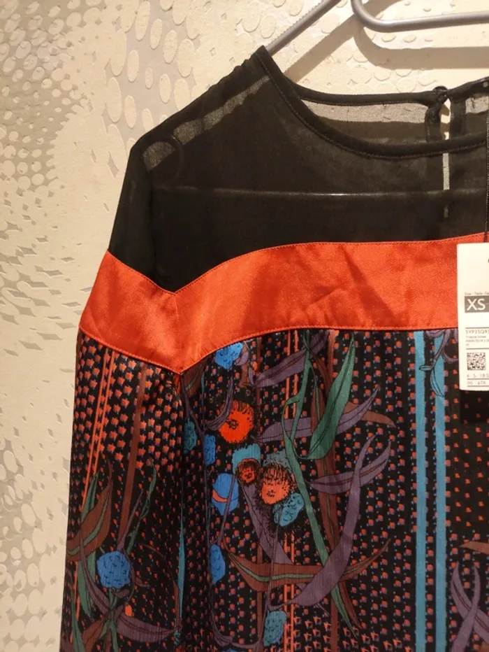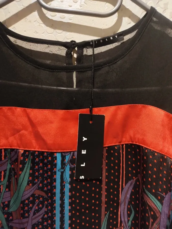 Magnifique blouse/top de la marque SISLEY en taille XS. Tissu léger et fluide avec empiècement col en voile/tulle noir et une jolie bande satinée rouge/orangé au niveau de la poitrine. Le corps et les manches présentent un imprimé riche et coloré (tons bleus, verts, violets sur fond sombre). Fermeture goutte d'eau boutonnée au dos. Neuf avec étiquette (voir photos). Composition principale : 100% Polyester. Prix réduits pour les lots 🌸 #SISLEY #Blouse #Top #Imprimé #Floral #XS #NeufAvecÉtiquette #Fluide #Chic