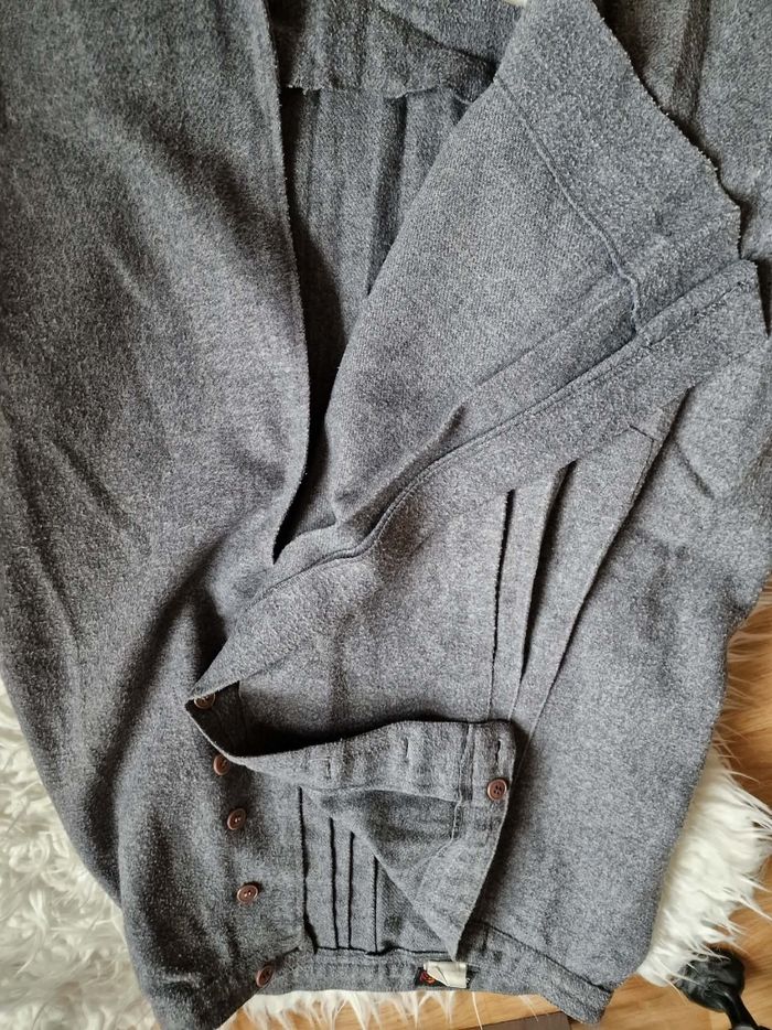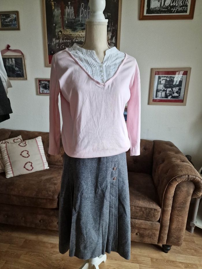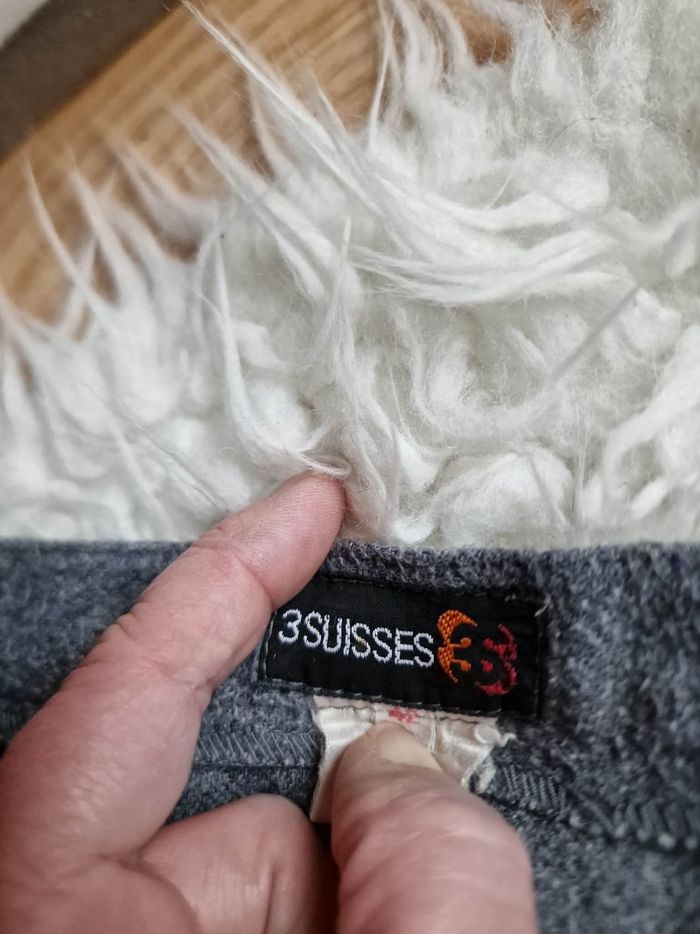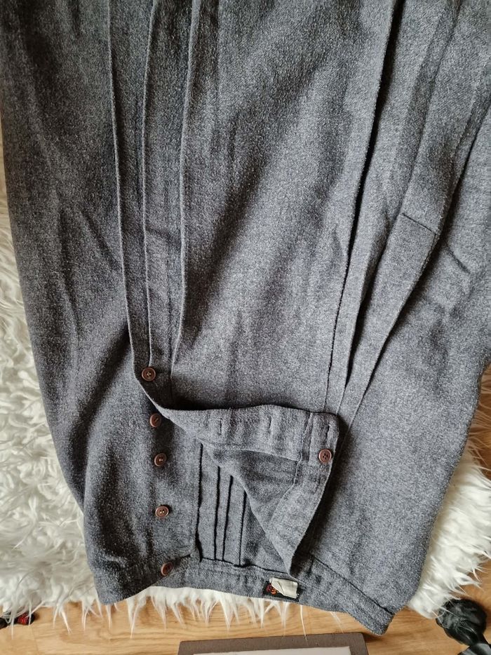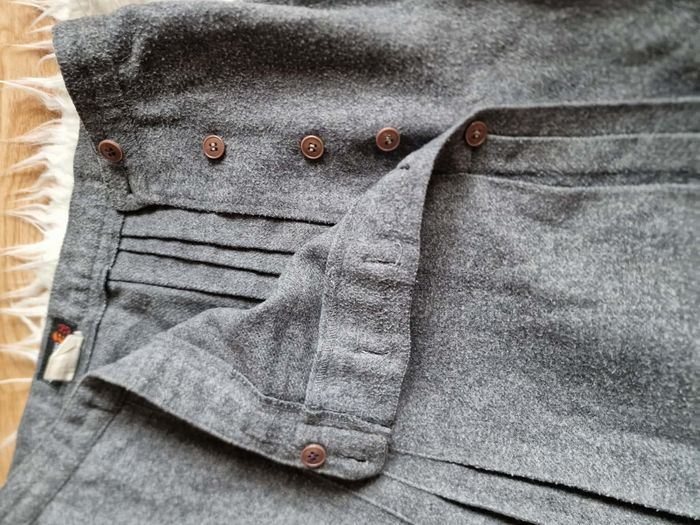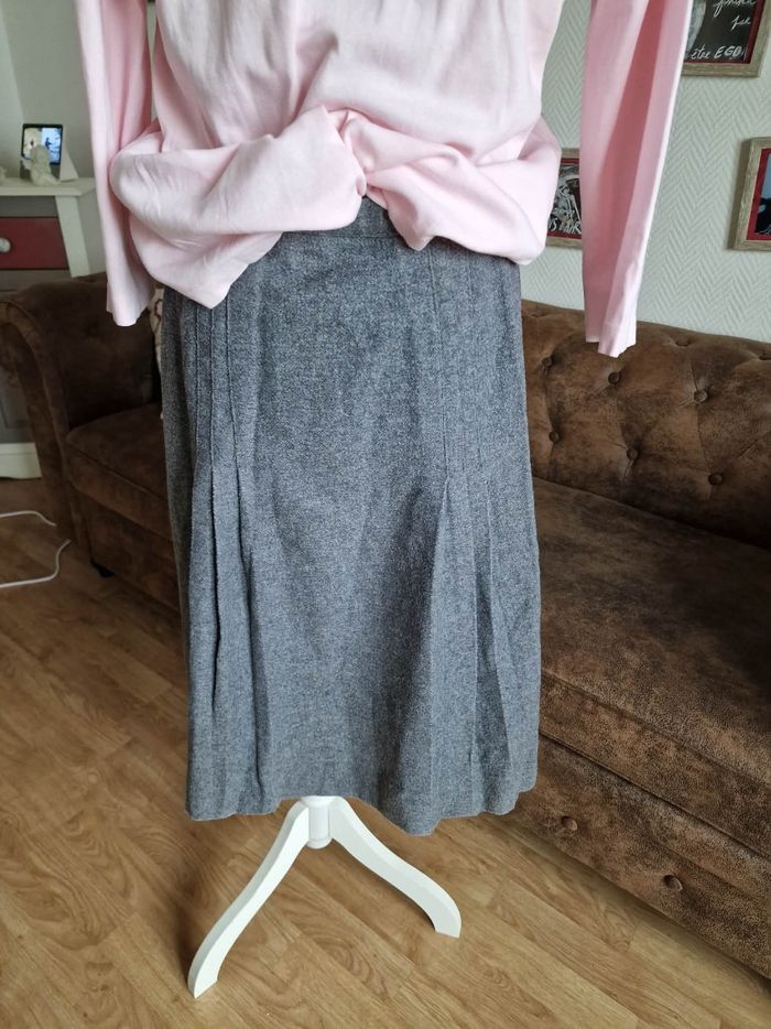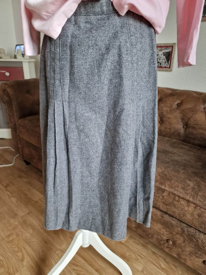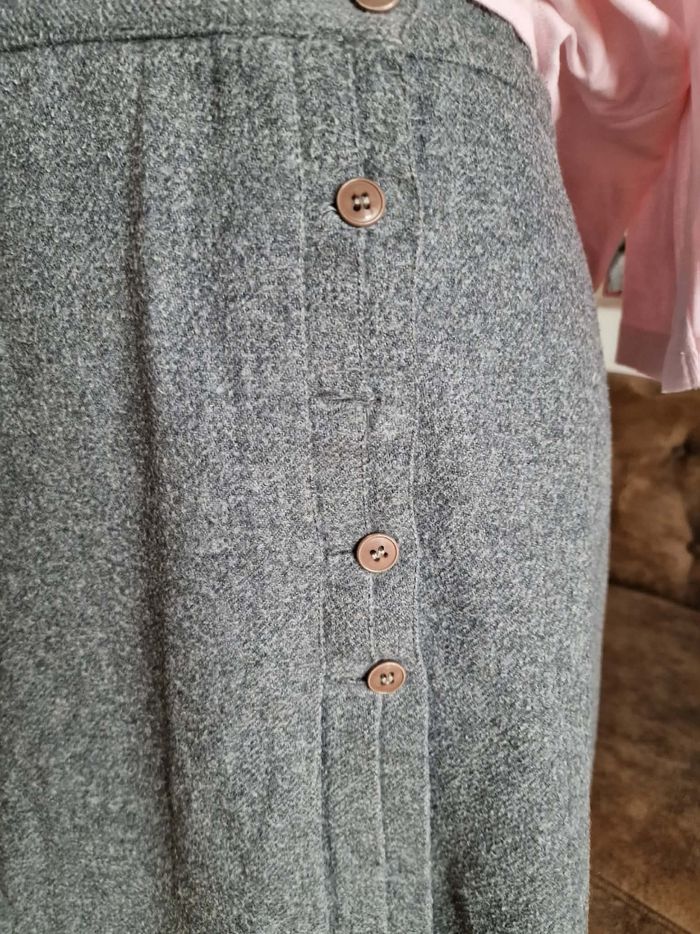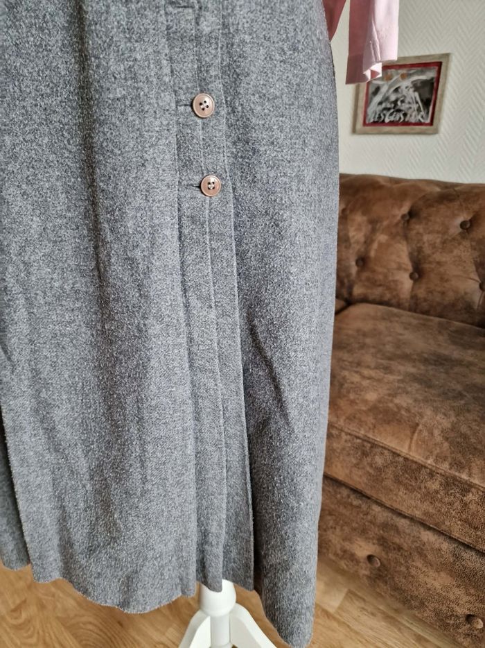​👗 Jupe Portefeuille Trapèze - Gris Anthracite - Look Vintage ​Description : ​Je vends cette jolie jupe grise à la coupe trapèze et au style portefeuille affirmé. C'est une pièce avec beaucoup de caractère, idéale pour un look hivernal ou mi-saison avec des collants et des bottines. ​Coupe : Forme trapèze avec un jeu de plis sur le devant. ​Fermeture : Boutonnée sur le côté gauche. À noter : La jupe s'ouvre naturellement à partir de la mi-cuisse (voir photos), ce qui apporte du mouvement et un côté un peu "fendu" à la marche. ​Détails : Boutons marbrés marron qui contrastent joliment avec le gris. Entièrement doublée pour plus de confort. ​Taille : S (indiqué sur l'étiquette). ​État : Portée régulièrement, elle a "vécu" et présente des signes d'usage normaux pour une pièce vintage (aspect de la matière un peu plus texturé par le temps), ce qui lui donne ce côté authentique. Elle reste en bon état général et tout à fait prête pour une seconde vie ! ​Idée look : Parfaite avec un pull col roulé noir ou rose pâle (comme sur la photo) pour un contraste doux.