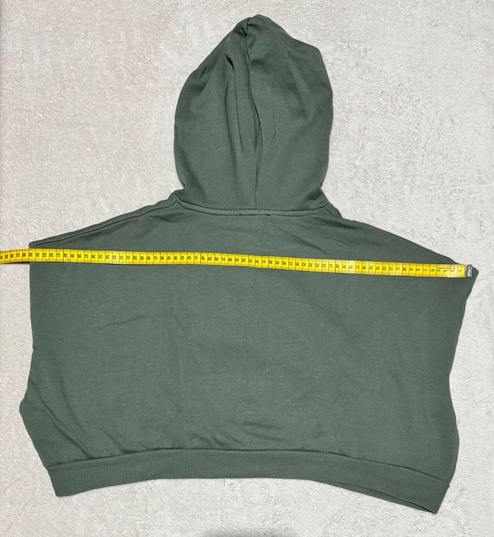 Superbe sweat à capuche de la marque Even&Odd. Sa couleur vert sauge (un beau vert grisé) est très tendance et facile à assortir avec un jean taille haute ou un legging. ✨ Détails du produit : Marque : Even&Odd Coupe : Courte (Crop top) et ample (Boxy) Couleur : Vert sauge / Vert kaki clair Matière : Intérieur tout doux (effet polaire léger), très confortable à porter. Taille : Du L au XL État : Très bon état général. 📏 Dimensions (voir photos) : Pour vous assurer qu'il vous convienne parfaitement : Largeur (aisselle à aisselle) : environ 65 cm (coupe volontairement large/oversize au buste). Longueur (épaule jusqu'en bas) : environ 41 cm. #63