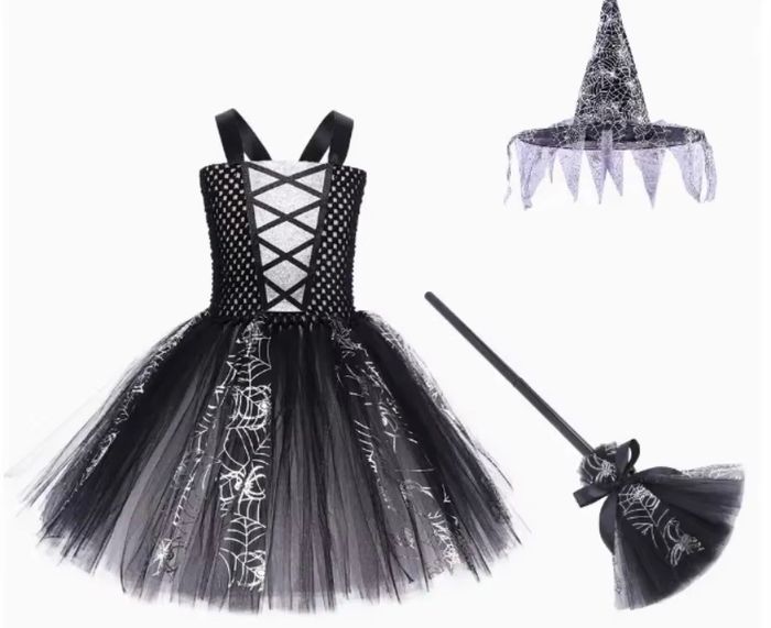 Déguisement robe princesse sorcière Halloween et ces accessoires (balais et chapeau). 2 tailles disponibles : - 4-5ans : longueur de la robe 65cm, - 6-7ans : longueur de la robe 70cm, Vendu dans leur pochette d’emballage d’origine, idéal pour faire un cadeau ! Expédition rapide après votre commande.
