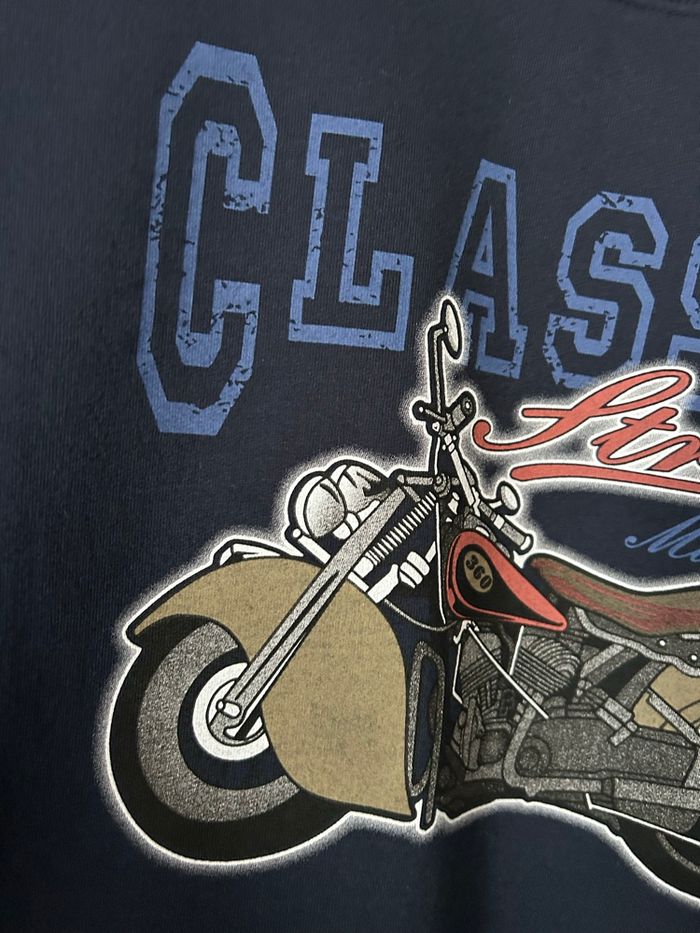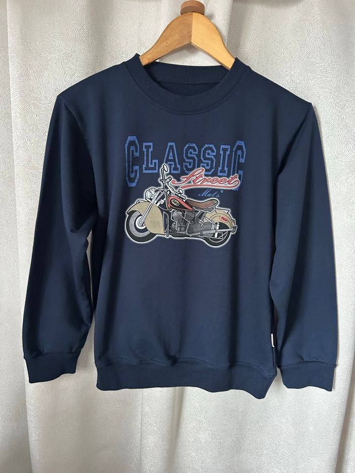 État neuf Pull sweat chaud molletonné sur l’envers Sérigraphie moto Taille 14 ans 50% coton 50% polyester Mat’s Carrure 42 cm Aisselle à aisselle 48 cm Longueur 58,5 cm
