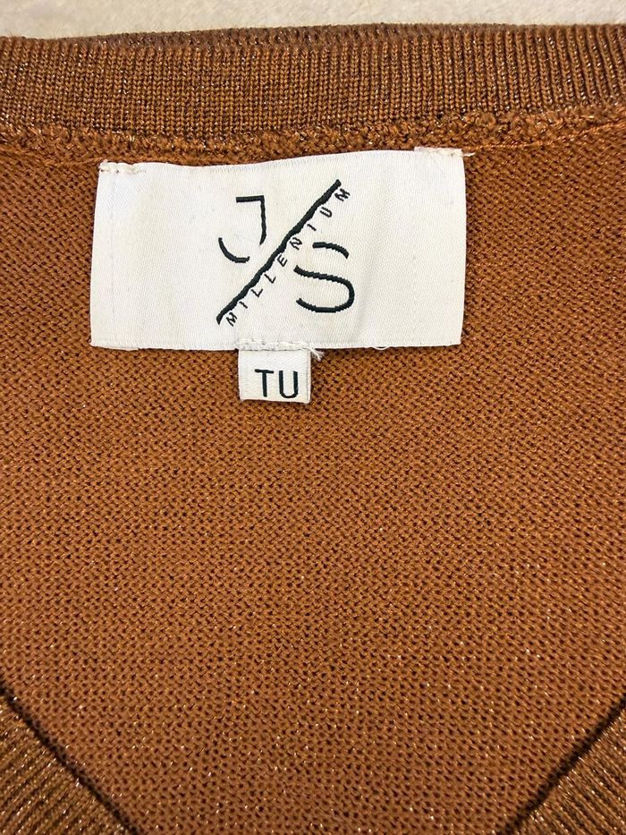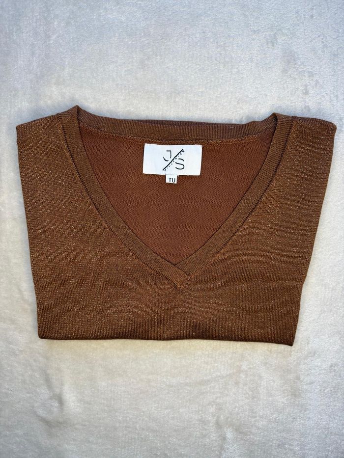 Je vends ce magnifique haut à col en V, idéal pour illuminer une tenue de soirée ou apporter une touche de lumière à un look décontracté. Couleur : Cuivré / Bronze avec des reflets pailletés (fils lurex). Coupe : Manches courtes, col en V, maille légère et fluide. Taille : Taille Unique (TU), convient généralement du S au L grâce à sa maille extensible. État : Très bon état, peu porté. Détails : La matière est scintillante mais reste douce sur la peau. Parfait avec un jean noir ou une jupe élégante. #6