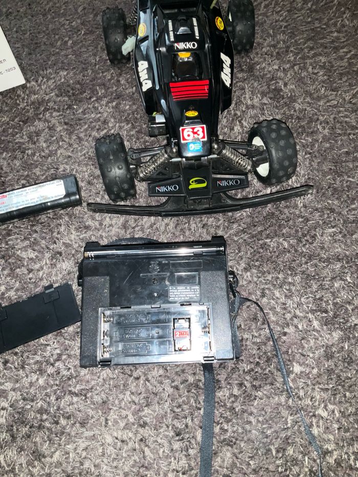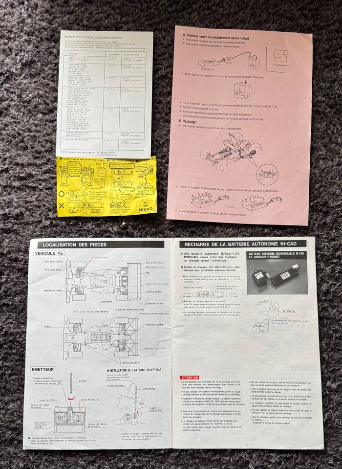 À vendre voiture radiocommandée Nikko Dictator II 4WD, échelle 1/10, modèle vintage des années 90, très recherchée par les collectionneurs et amateurs de RC rétro. La voiture est complète, avec sa boîte d’origine, la radiocommande, le chargeur, la batterie Ni-Cd, ainsi que toutes les notices et documents d’origine (voir photos). Modèle prêt à fonctionner, sans montage nécessaire. 🔧 Caractéristiques Marque : Nikko Modèle : Dictator II Transmission : 4 roues motrices (4WD) Échelle : 1/10 Fréquence : 27 MHz Double moteur (tandem) Suspension indépendante avant et arrière Différentiels avant et arrière Pneus à picots tout-terrain Commande proportionnelle 2 canaux Batterie rechargeable Ni-Cd 7,2V Chargeur secteur Nikko inclus 📦 Contenu du lot Voiture RC Nikko Dictator II Radiocommande d’origine Batterie Ni-Cd Chargeur Nikko Notices / schémas / liste des pièces Boîte d’origine avec calages en polystyrène 👉 Lot complet, très rare dans cet état. ⚠️ État Bon état général pour un modèle vintage Traces normales d’usage visibles (voir photos) Boîte d’origine avec marques d’âge Fonctionnement OK (à noter : batterie ancienne, autonomie conforme à l’âge) 📸 Photos contractuelles : vous achetez exactement ce qui est présenté.