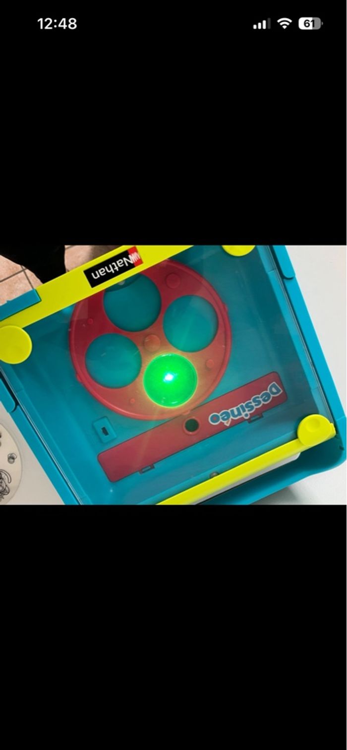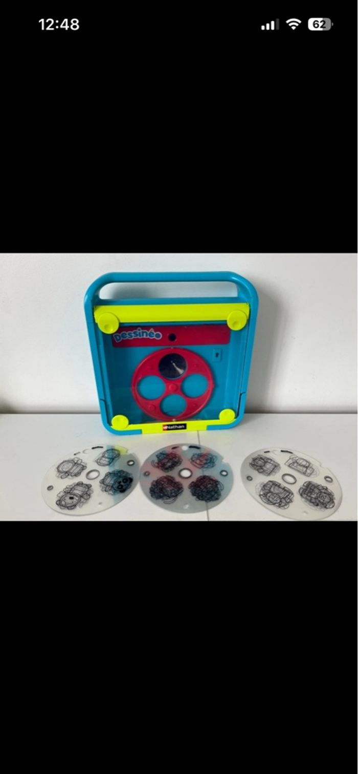 En bon état, ( quelque trace de rayure sur le dessus mais ne gêne absolument en rien) fonctionne très bien Il y as 30 disques de dessin et 3 niveau Facile moyen difficile