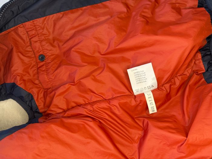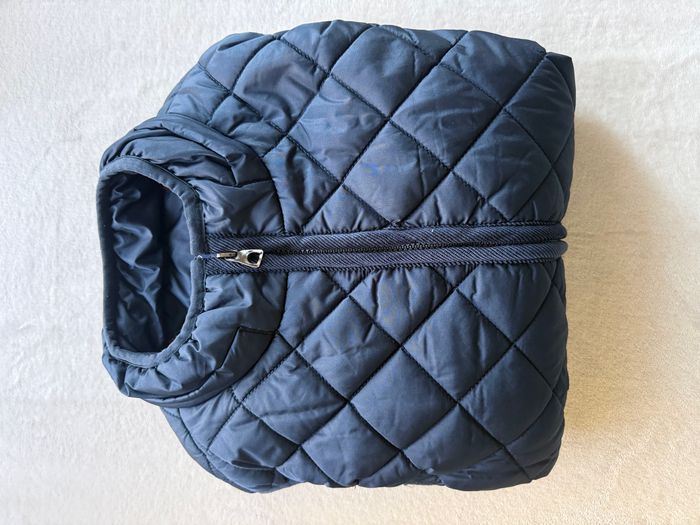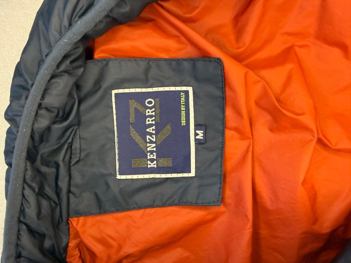 Vends gilet sans manches (bodywarmer) de la marque Kenzarro. Un classique indémodable, idéal pour la mi-saison ou à porter sous un manteau. Marque : Kenzarro (Design by Italy) Taille : M Couleur : Bleu marine extérieur / Doublure intérieure orange contrastante Matière : 100% Nylon (léger et résistant) Détails : * Matelassage en losanges élégant. Fermeture zippée robuste. Deux poches latérales. Une poche intérieure boutonnée pratique. État : Très bon état général. Note importante : Le gilet est vendu sans la capuche amovible (perdue), comme on peut le voir sur les photos. Cela ne gêne en rien le port du gilet qui possède un col montant propre. #49