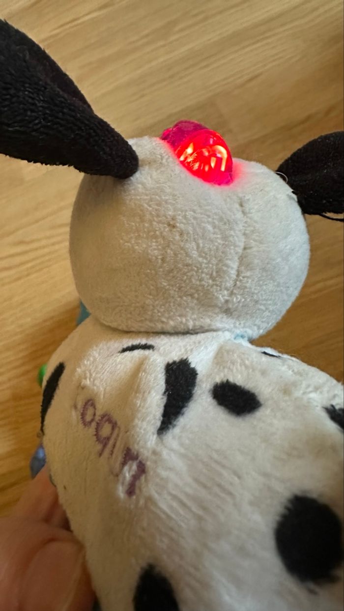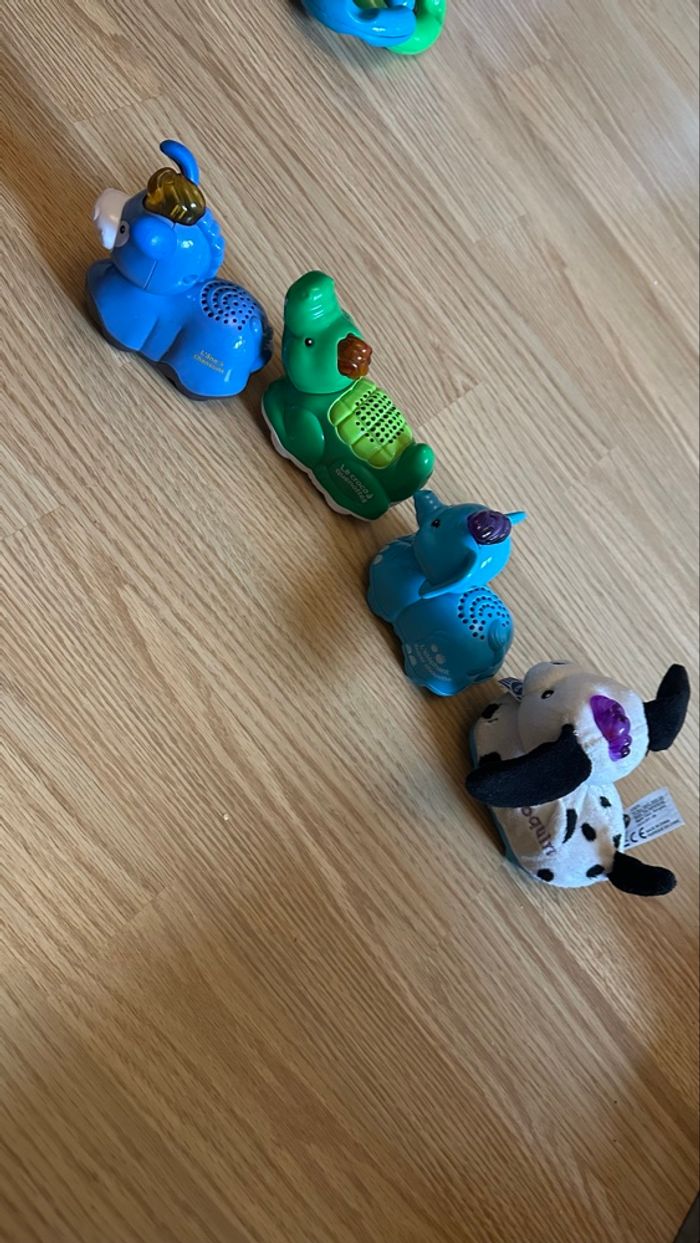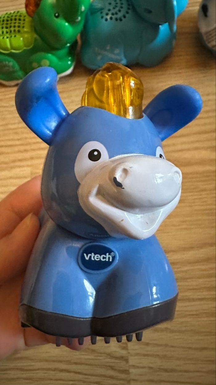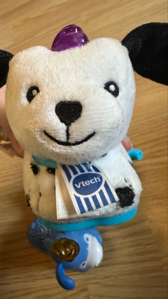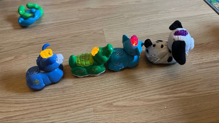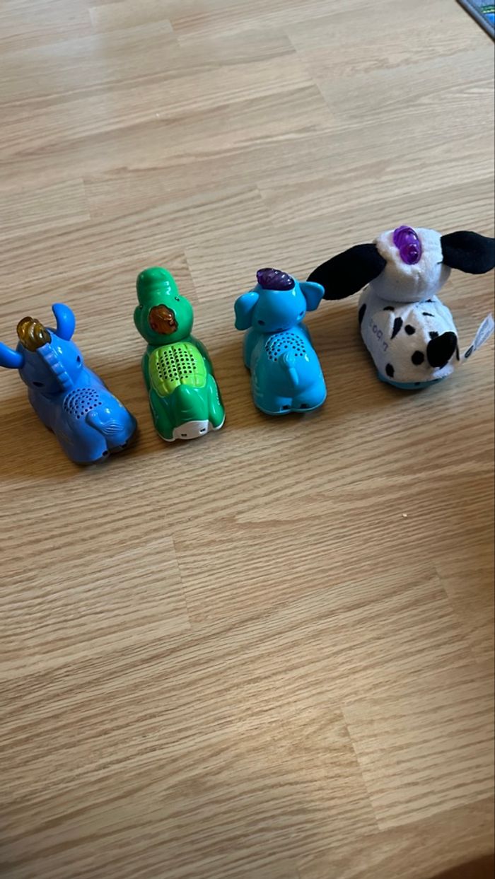 Chardon l’âne à chanson Trompette l’éléphant super chouette Cracotte le crocodile à quenottes Et coquins recouvert de tissus Ils fonctionne tous très bien Vendus sans pile 12euros le lot Étant donné que le chien est en tissus il peut présenter des p’endroits où le blanc est légèrement gris claire ou des petites taches marronees très claires c est très peu visible ( photos de près ) je n ai jamais tenté de le nettoyer donc un nettoyage en surface est possible au bicarbonate ou au vinaigre blanc pour faire partir par exemple