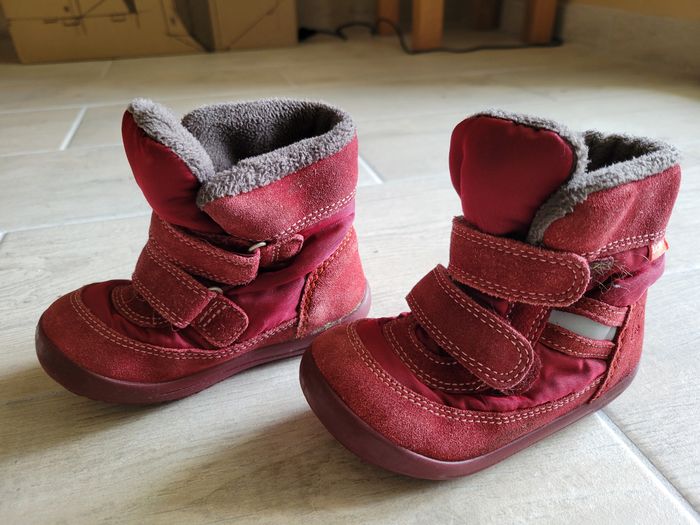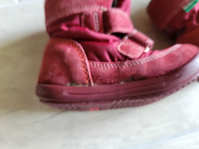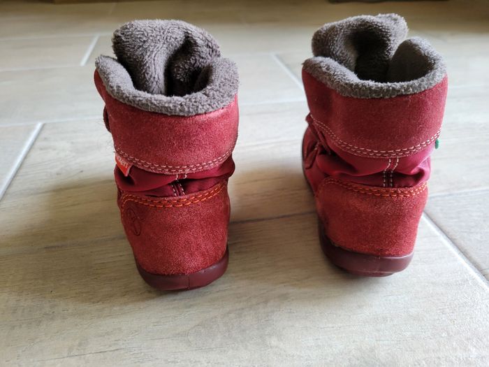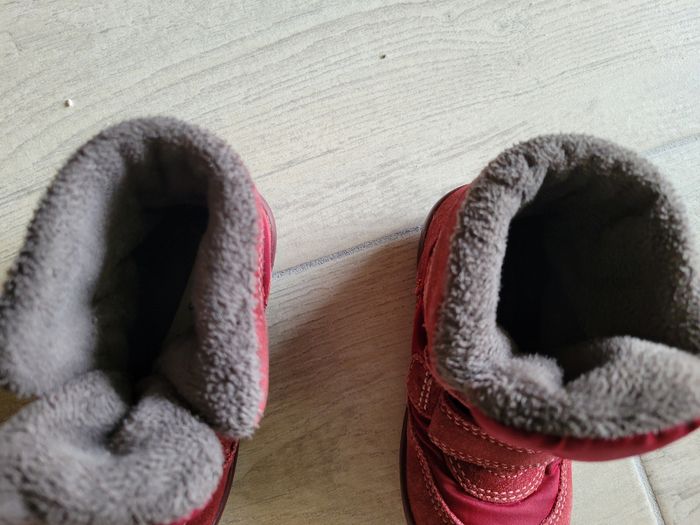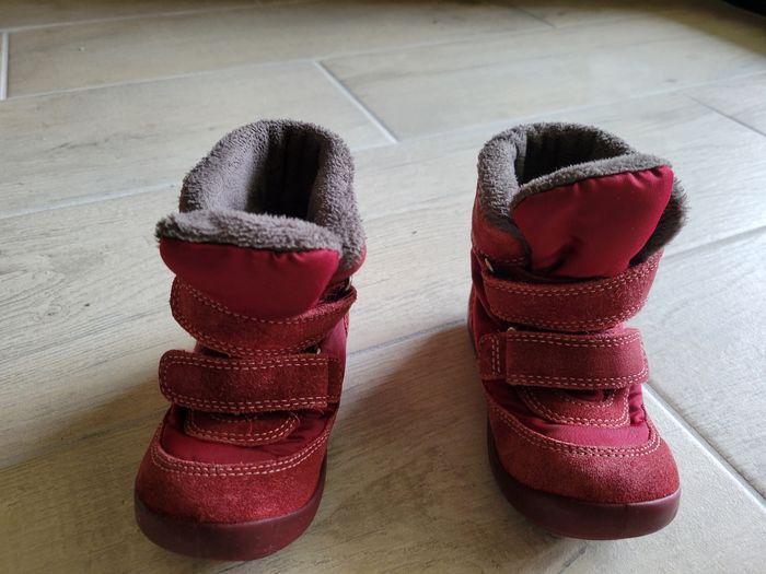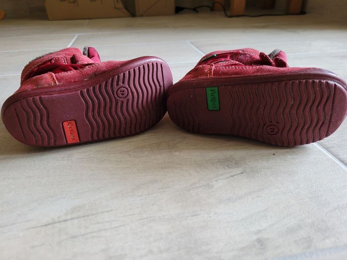 Bottines bordeaux de la marque Kickers et de taille 24. Fourrées, elles sont agréables pour l'hiver. Quelques traces d'usure en bas des chaussures (voir photo) mais bon état général.