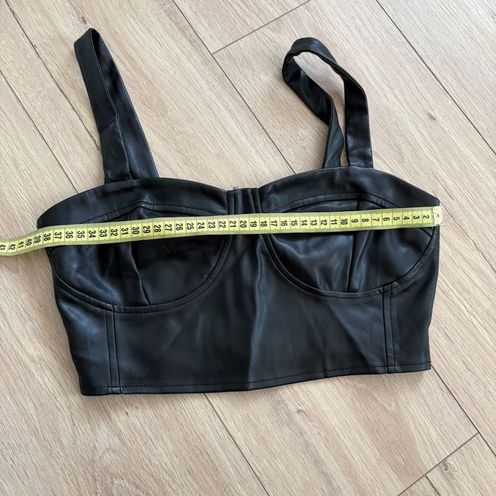 Superbe top court en simili cuir noir, très tendance et facile à associer avec un jean, une jupe ou un blazer pour un look chic ou rock. Bonnets structurés pour un joli maintien, bretelles larges confortables. Taille non indiquée sur l’étiquette – correspond à un 34 / XS (voir mesures en photos) Très bon état Idéal pour une soirée, un look urbain ou une tenue stylée. Envoi rapide