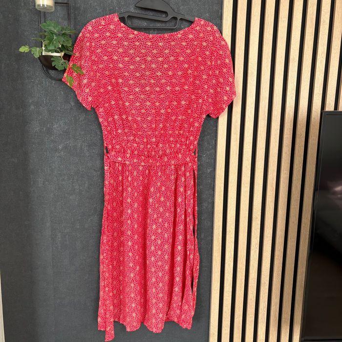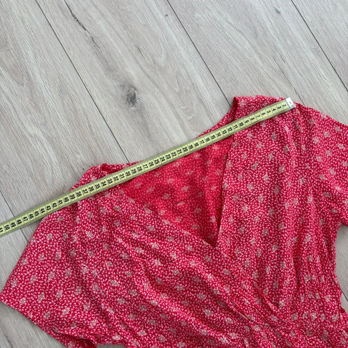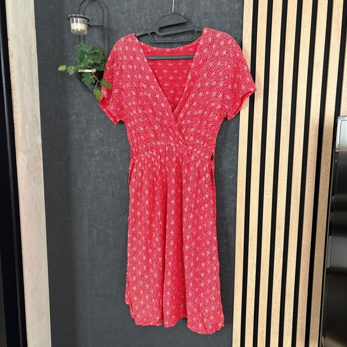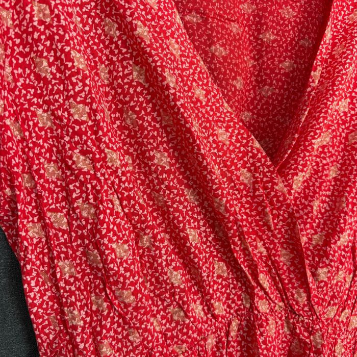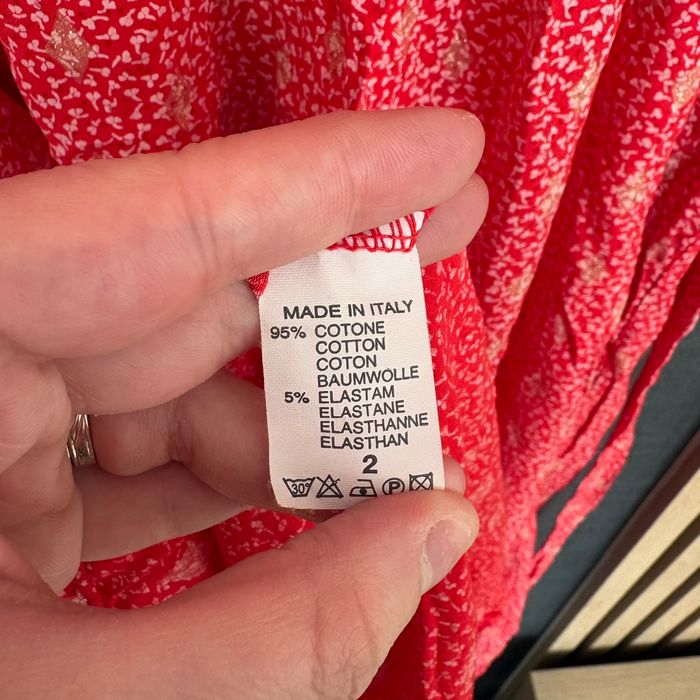 Très jolie robe rouge à imprimé fleuri, fluide et agréable à porter. Décolleté cache-cœur, taille marquée pour une belle silhouette. Tissu extensible (95% coton / 5% élasthanne), confortable et respirant. Made in Italie Taille non indiquée sur l’étiquette, correspond environ à un 38 / 40 (40cm aux épaules, et élastique à la taille tiré au maximum 46cm) Très bon état, la ceinture se découd au milieu Idéale pour l’été, une sortie, un look casual chic ou une occasion. Envoi rapide N’hésitez pas à me demander plus de mesure