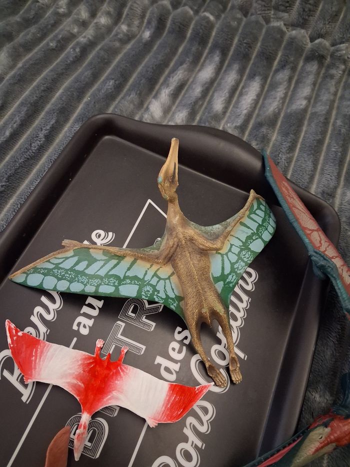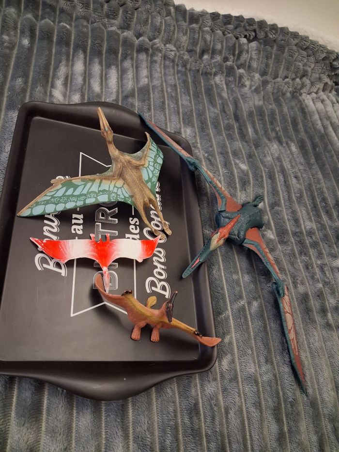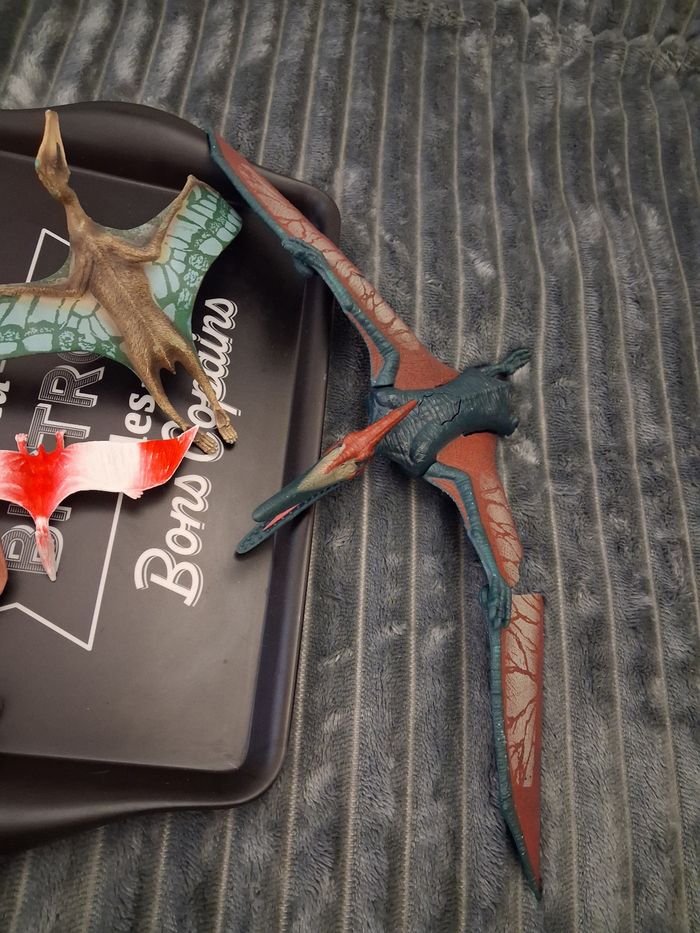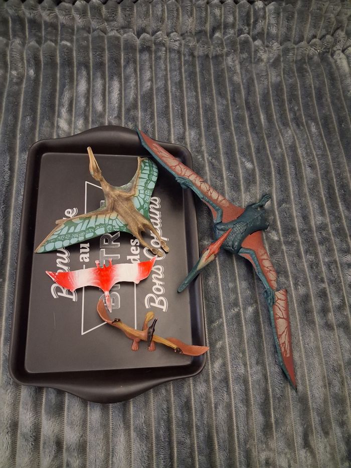 Lot de 4 reptiles volants (Dinosaures) avec 3 Ptérodactyles dont un avec les ailes amovibles et qui bouge grâce à un bouton à actionner et 1 Quetzalcoaltus, de taille différentes ⚠️ Merci de bien voir toutes les photos, le Quetzalcoaltus à une marque sous ses ailes et le grand Pterodactyle à une pate en moins, rien d'autres à signaler N'hésitez pas à me contacter si vous avez des questions 😀