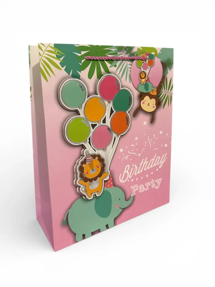 Sac cadeau idéal pour célébrer un anniversaire d’enfant. Son motif savane avec des animaux et des ballons apporte une touche joyeuse et festive, parfaite pour une fête réussie. Sa taille généreuse permet d’y glisser facilement des cadeaux, jouets ou accessoires. Solide et pratique, ce sac est parfait pour offrir un présent de façon soignée et colorée. Dimensions : 26 × 32 × 10 cm