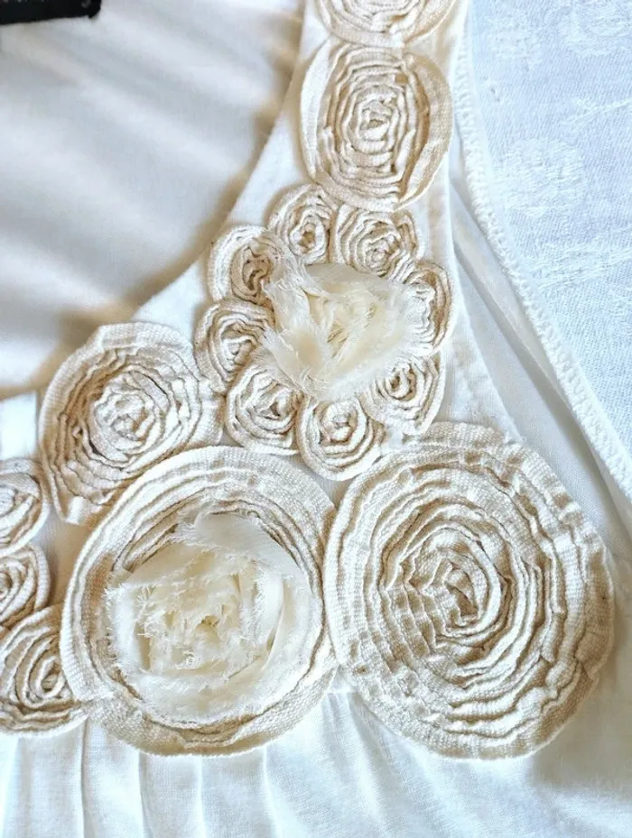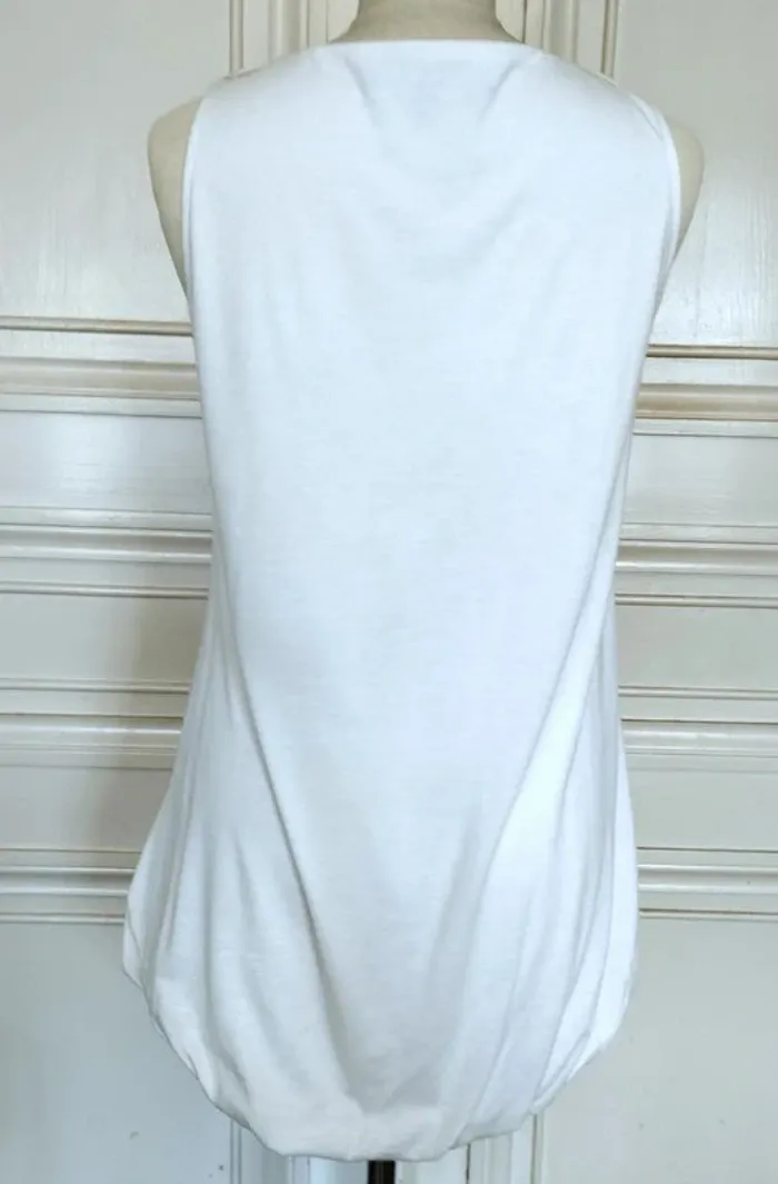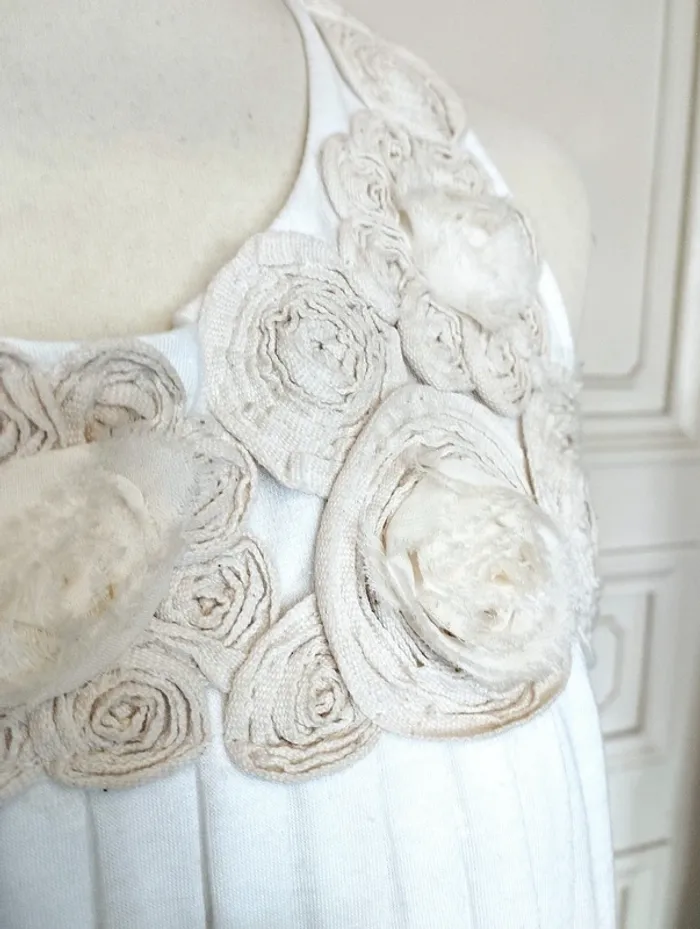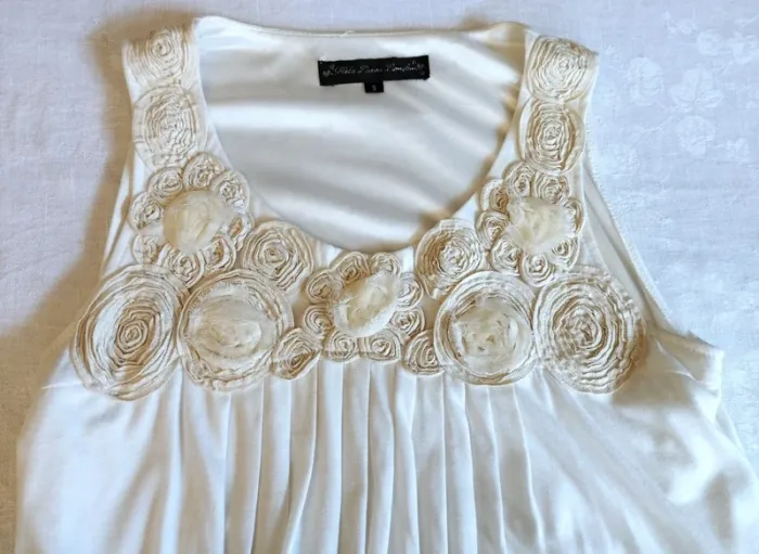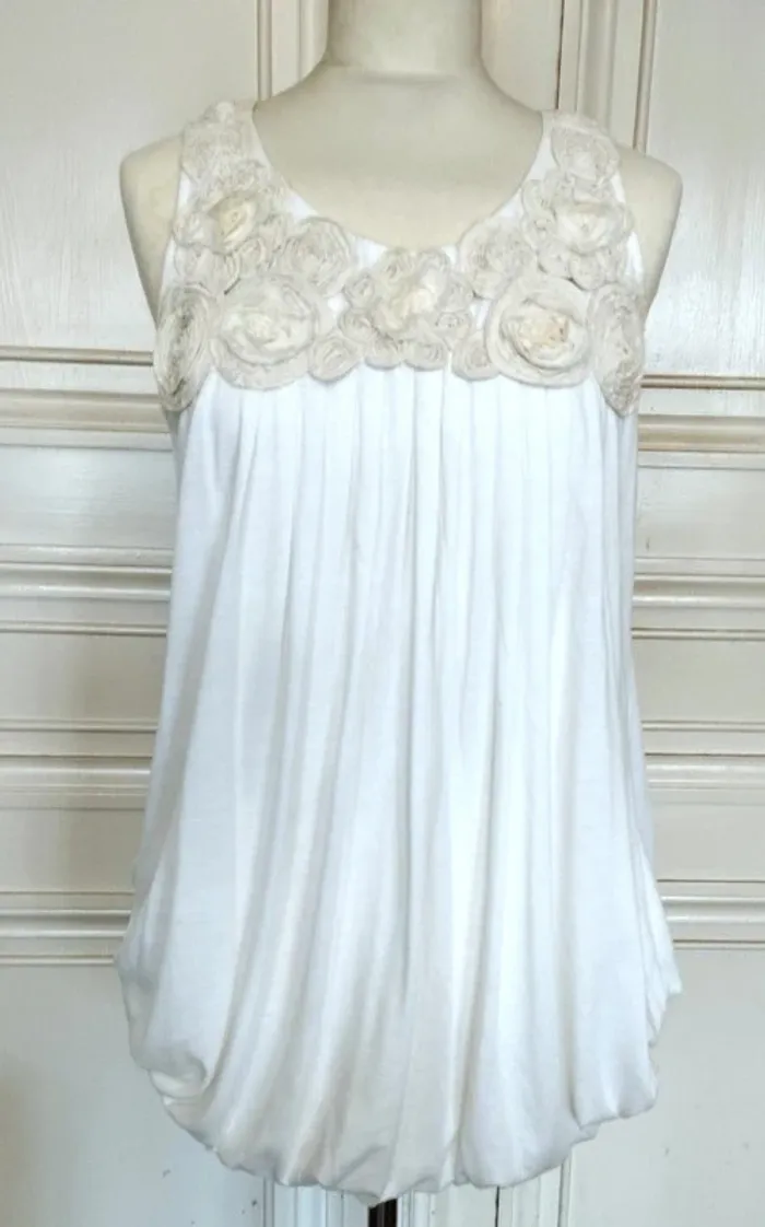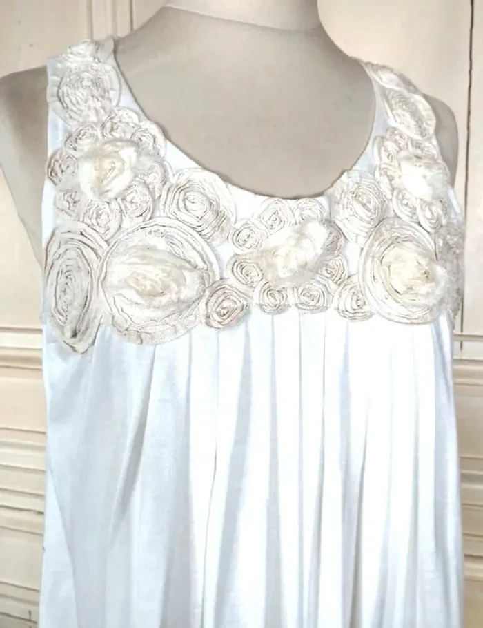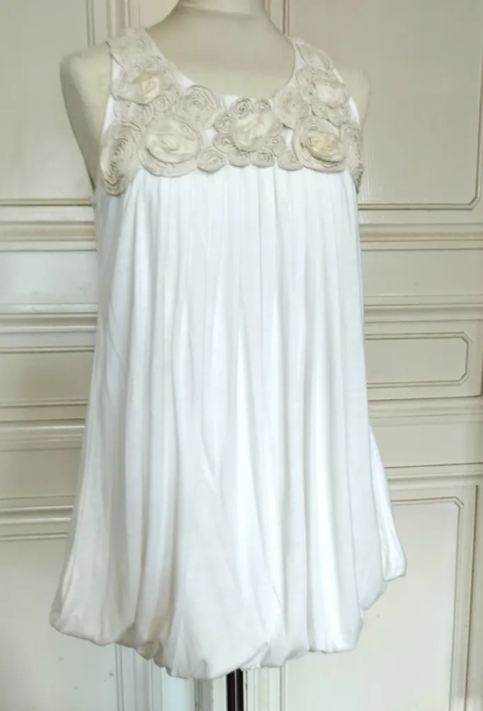 MELA LOVES LONDON ROBE TUNIQUE T UK S CORRESPOND A UN 36/40 VOIR MESURES DETAILLEES AU BAS MODELE TRENDY ULTRA FEMININ TISSU ULTRA DOUX COLORIS BLANC ROBE INTERNE SATINéE ASSORTIE BAS DE LA ROBE COUSU ET RELIé AU BAS DE LA DOUBLURE DONNANT CETTE COUPE BALLOON AMUSANTE AVEC MINI FRONCES COL ARRONDI OUVERTURE 21 CM PROFONDEUR 16 CM BRETELLES EMI LARGES CONFORTABLES PLASTRON PARTANT DES EPAULES DEVANT COUVRANT LE HAUT DU BUSTE EN ROSACES DE TISSU CREME NUDE AVEC 4 AUTRES ROSACES BLANCHES AVEC REBORDS EBBOURIFFéS SERIE DE PLIS PLATS CENTRAUX PARTANT SOUS LE PLASTRON ET ACCENTUANT L EFFET BALLOON 65% POLYESTER 35% VISCOSE EXTENSIBLE MESURES PRISES A PLAT SANS ETIRER POITRINE 48 CM TAILLE NON MARQUEE 62 CM BAS 58 CM LONGUEUR 75 CM