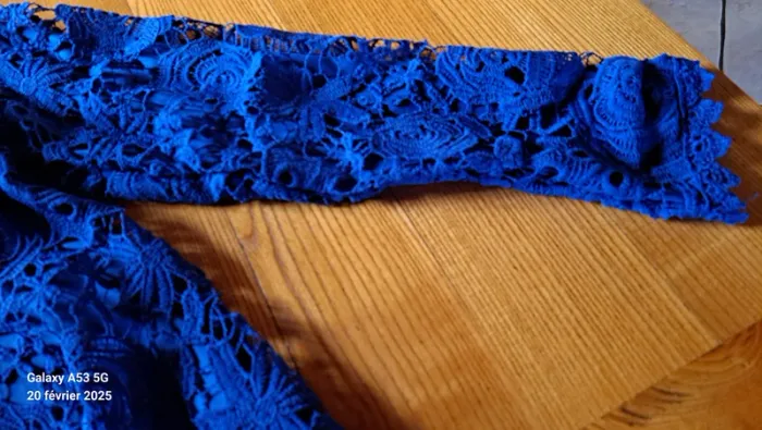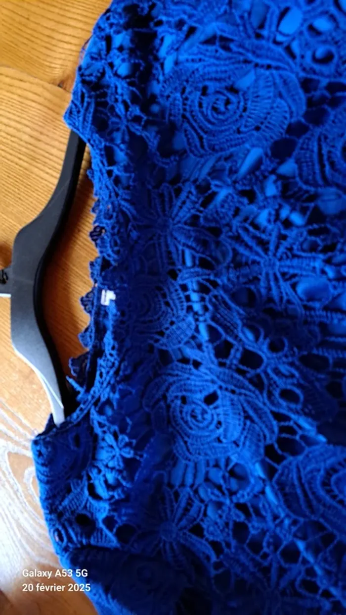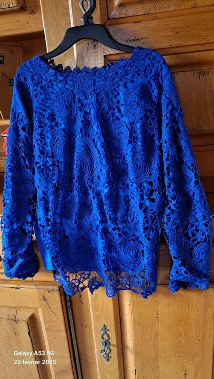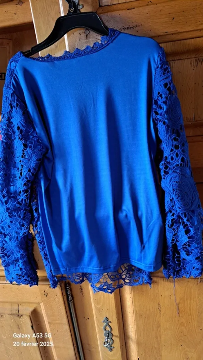 Blouse tee shirt neuve, jamais portée, dentelle sur le devant qui est doublé, unie au dos. Notée taille S mais correspond à une taille M Aisselles à aisselles 45 cm Hauteur 60