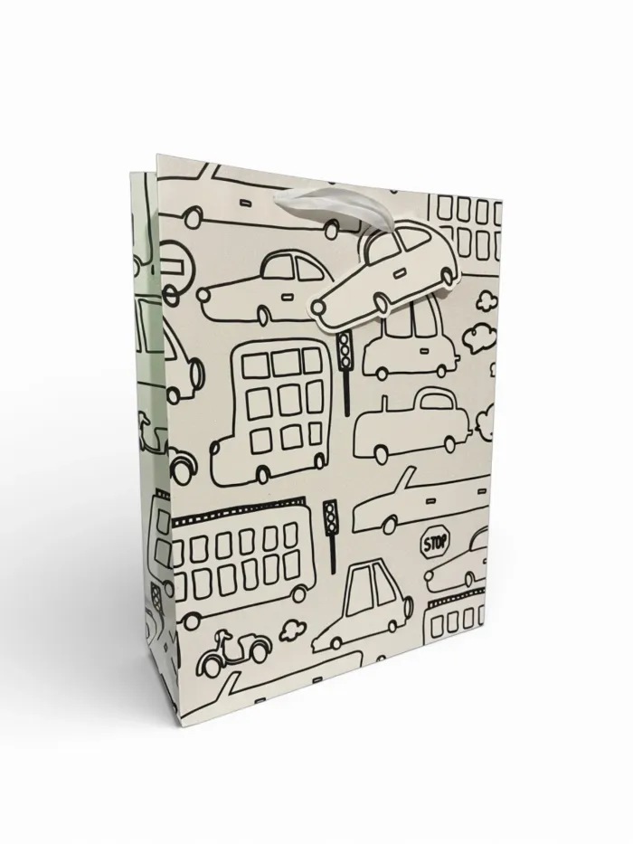 Offrez vos cadeaux avec style grâce à ce sac Mikirei au motif circulation routière. Avec ses voitures, panneaux et routes colorés, il apporte une touche ludique et originale à vos présents. Parfait pour les enfants ou les amateurs de motifs fun et dynamiques. Dimensions : 32 x 42 x 11,5 cm.