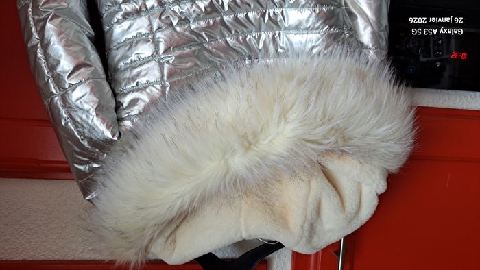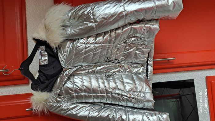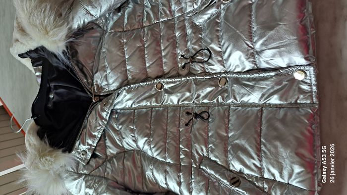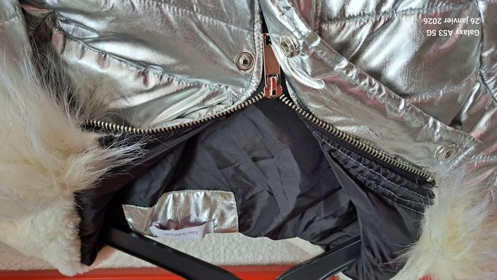 Doudoune Julie Guerlande taille 38, gris argenté métallisé comme neuve, très peu portée aisselles à aisselles 50 cm hauteur 57 cm Capuche non amovible Peut être resserrée à la taille
