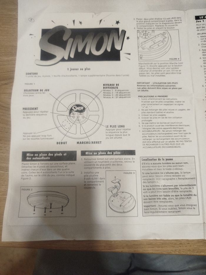ℹ️ MB Jeux 🗓️ 1996 ⚠️ Manque un pied en caoutchouc ℹ️ Fonctionne avec 1 pile 9 volt 6LR61 + 2 piles LR20 (non fournies) ⚠️ Cependant les piles LR20 20 fonctionne grâce à une lamelle d'allunium que vous devez placer entre la pile et le contacteur droit, car il y a de l'oxidation ✅ L'état est visible sur les photos, la boîte est abîmée N'hésitez pas à consulter mes autres articles pour faire des lots ! Jeu, jeu de société, Simon, idée cadeau, Vintage, collection, rare, Geek Street....