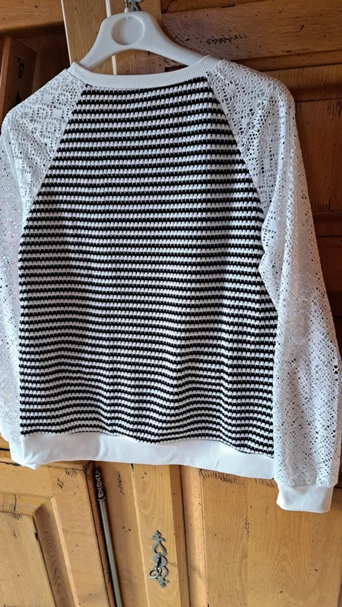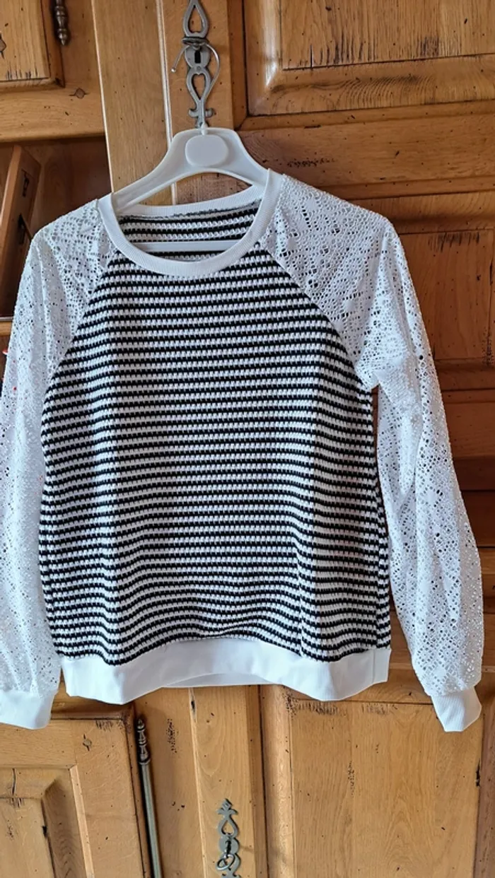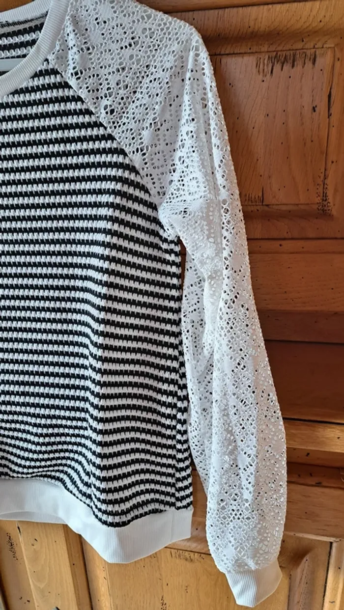 Tee shirt noir et blanc, manches en dentelle, très peu porté, état parfait, polyester élasthane