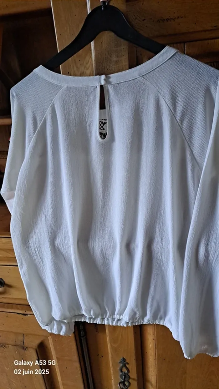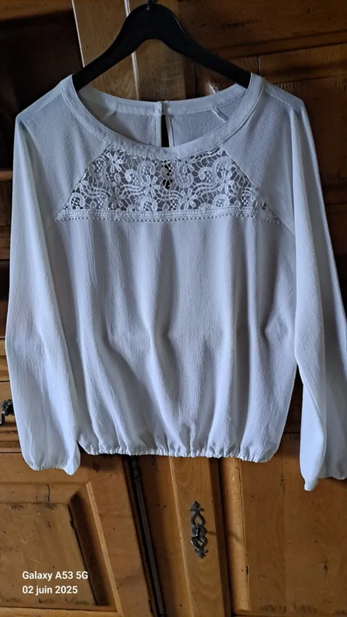 Jolie blouse blanche dentelle avec élastique à la base et aux poignets. Très bon état.