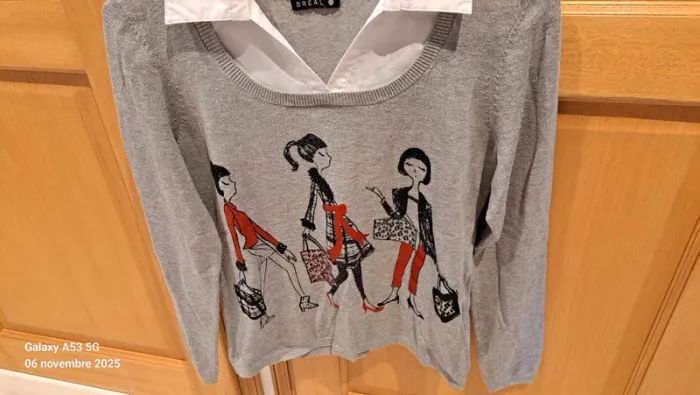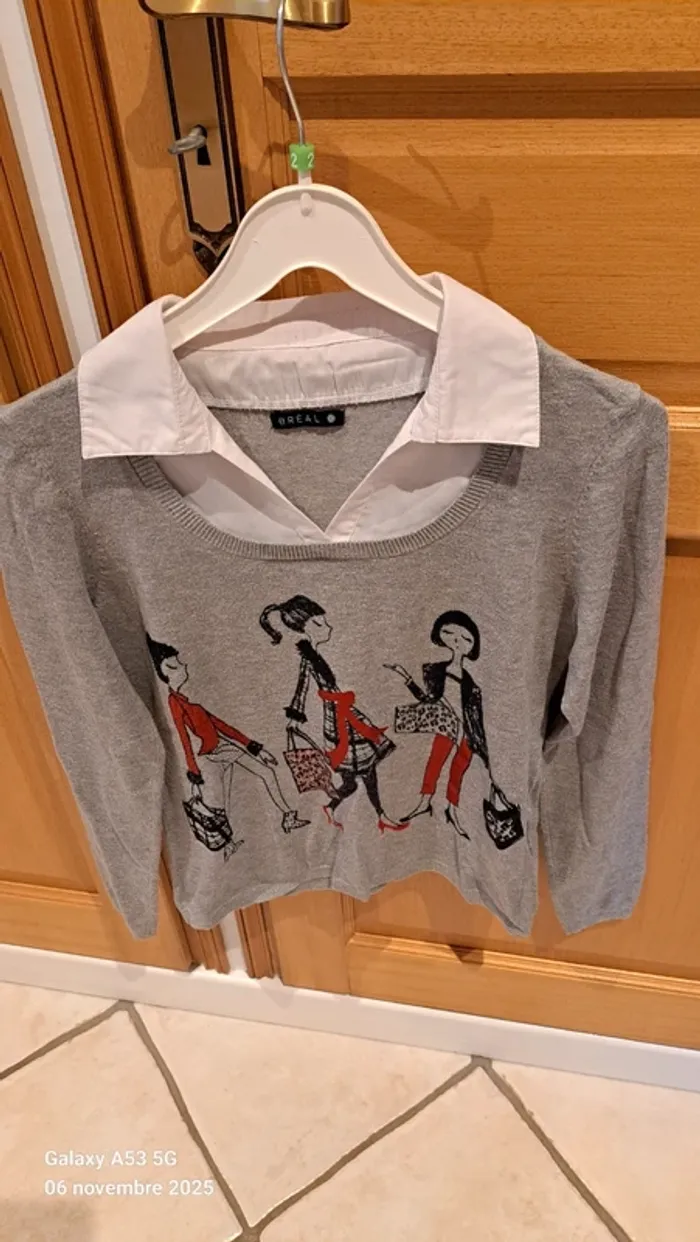 Pull gris 2 en 1 col chemisier blanc, Bréal, parfait état, avec joli motif