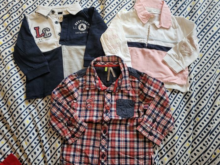 Vends lot de vêtements printemps / automne garçon, taille 12 mois. Diverses marques : sergent major, tissalia, kiabi, orchestra. Très bon état. 3 pantalons 1 chemise à carreaux 2 polos style rugby (dont 1 Eden Park) 4 tee-shirts manches longues 2 paires de chaussettes chaudes 1 béret gris