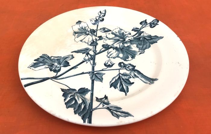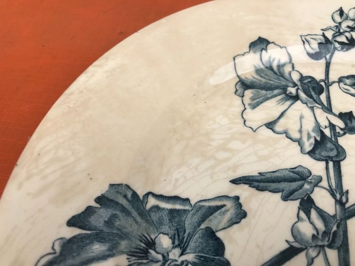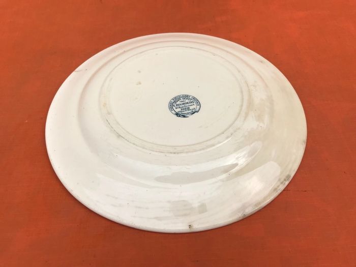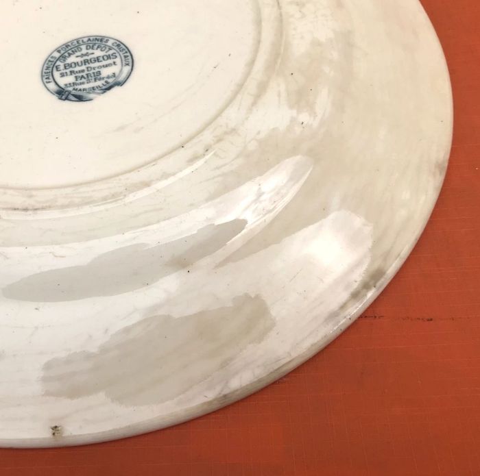 (article vendu en l' état, nous précisons traces dans l' émail voir photo (3 et 4) état d' usage voir toutes les photos) Ancien plat de service Terre de Fer Grand dépôt Emile Bourgeois Paris Faïences Porcelaines Cristaux Décor floral Diamètre : 285mm Hauteur : 28mm Poids : 720grs