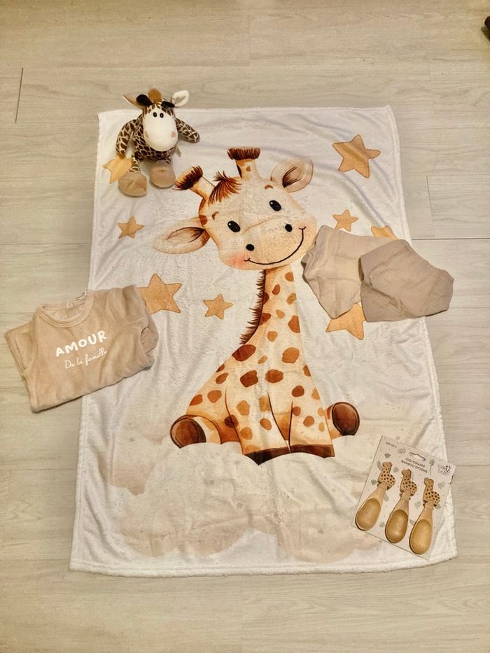PRÊT À ENVOYER ET À OFFRIR SERA EMBALLÉ DANS DU PAPIER TRANSPARENT. Gâteau de couches mixte thème girafe 🦒 composé de : - 45 couches Pommette (T2 et T3) - 1 doudou girafe 🦒 - 1 plaid tout doux motif girafe 🦒 - 1 pyjama en velours beige (3 mois) 💤 - 1 brosse et peigne en bois - 2 bavoirs bandanas en gaz de coton 🍼 - 3 cuillères repas en bambou motifs 🦒 +deco/ruban et papier transparent.
