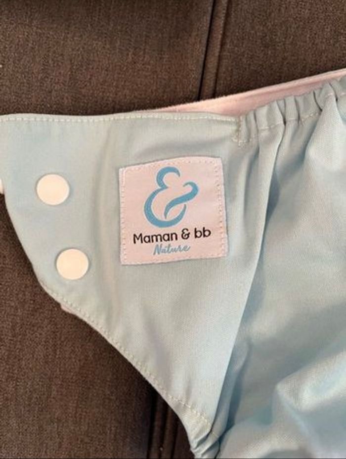 Vend lot complet de couches lavables marque maman et bb nature. Taille évolutive jusqu’aux 3 ans de l’enfant. Le lot comprend: -20 couches avec 20 inserts micro fibres - 10 inserts bambou - 10 inserts Chambon - 2 rouleaux de lingettes jetables - 1 sac de transport imperméable Utilisé 4 mois, très bon état.
